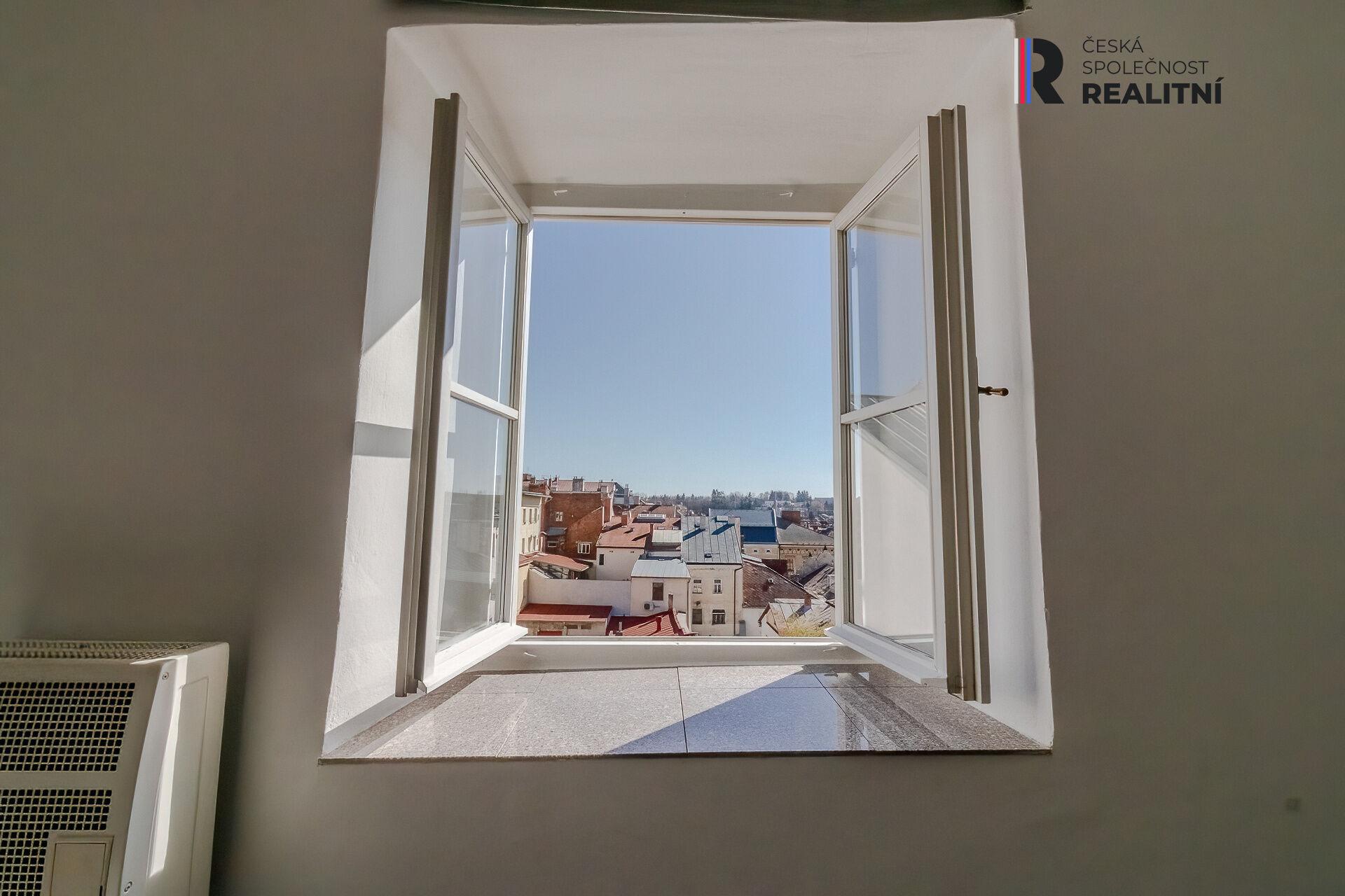 - Obytná místnost s výhledem do historických uliček.