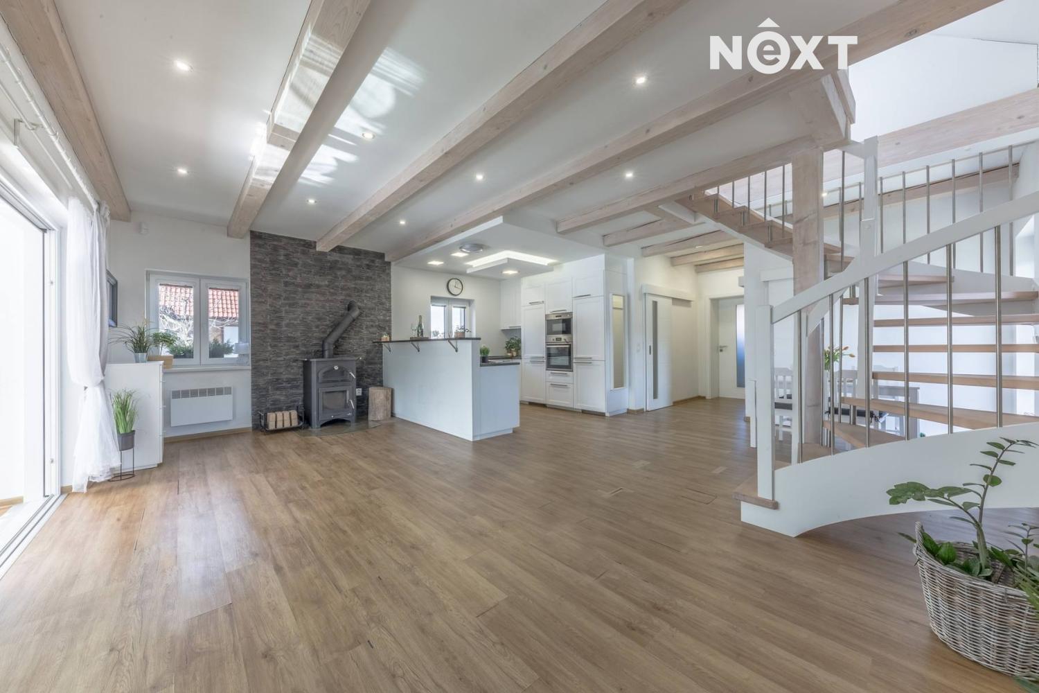Podlahy v dekoru dřeva, dubové samonosné schodiště a celkové provedení v moderním rekreačním stylu podtrhují pocit kvalitní a nadčasové stavby.