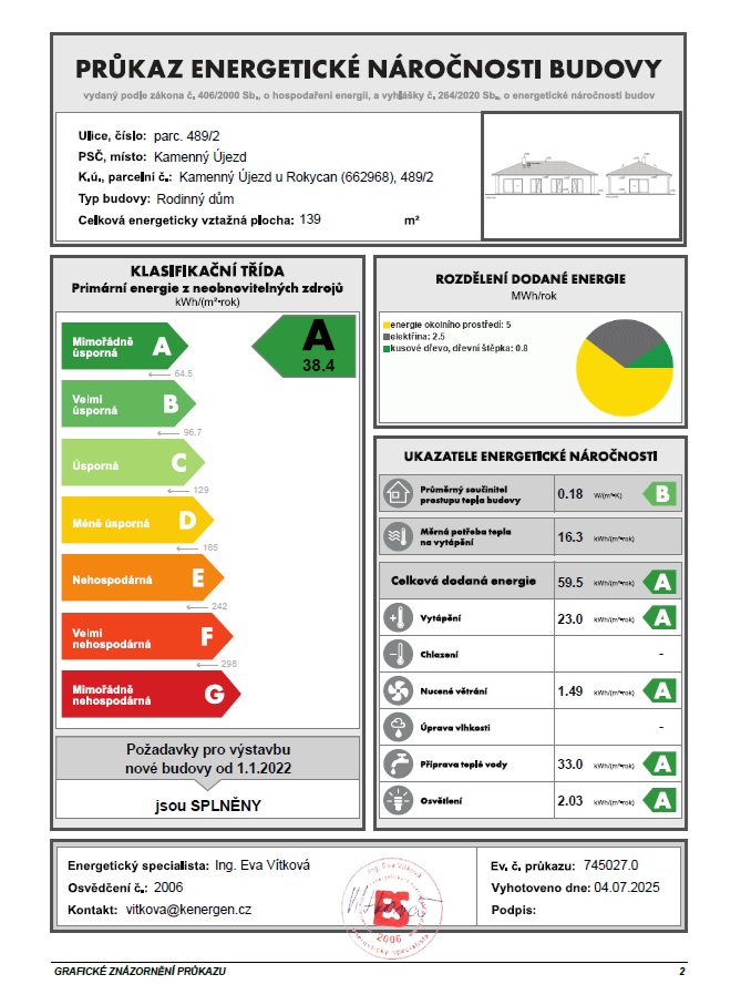 Nemovitost bude splňovat energetickou třídu A, což zaručuje nízké provozní náklady, kvalitní zateplení a moderní technologie šetřící energii i peníze. Vytápění a ohřev teplé vody je zajištěno tepelným čerpadlem a větrání probíhá pomocí vzduchotechnické jednotky s rekuperací, která zajišťuje zdravé vnitřní prostředí a minimalizuje tepelné ztráty.