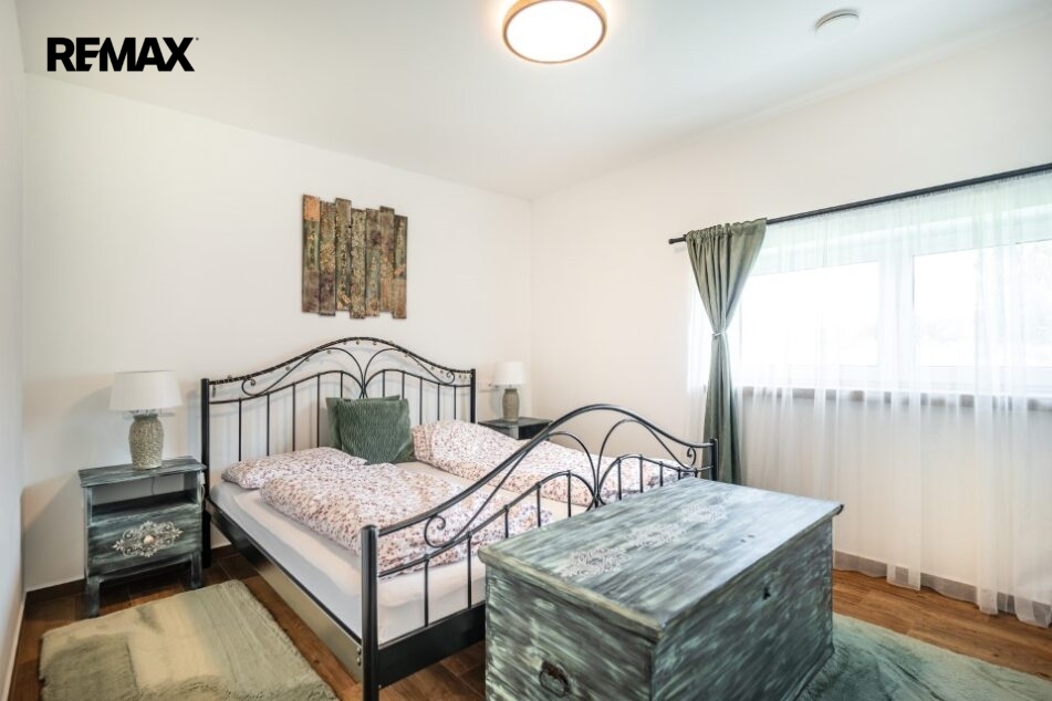 Dispoziční řešení bytové jednotky 4 + kk o užitné ploše 160 m2 se rozprostírá v prvním a druhém nadzemním podlaží. 1.NP se sestává ze vstupního zádveří a chodby 12 m2, kuchyně s jídelním koutem propojené s obývacím pokojem 44 m2, ložnice 13 m2, koupelny 5 m2 s prostorem pro prádelnu, dvou skladů - šaten, WC a technické místností 9 m2. Do 2.NP se vstupuje po dřevěném schodišti a najdeme zde dva prostorné pokoje, koupelnu, WC, sklad či šatnu a pracovní kout. Orientační půdorys jednotlivých místností najdete ve fotodokumentaci.