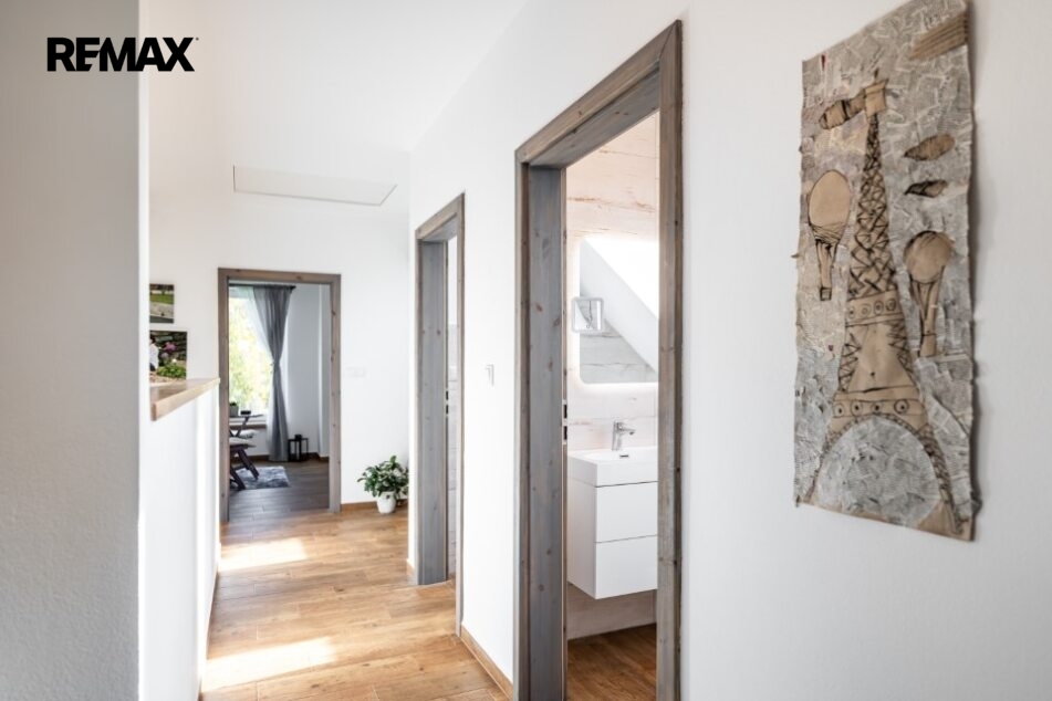 Interiér domu je kompletně hotový, velmi vkusně zařízený včetně moderní kuchyně a je laděn do harmonického celku, každý detail je součástí promyšlené koncepce příjemného bydlení.