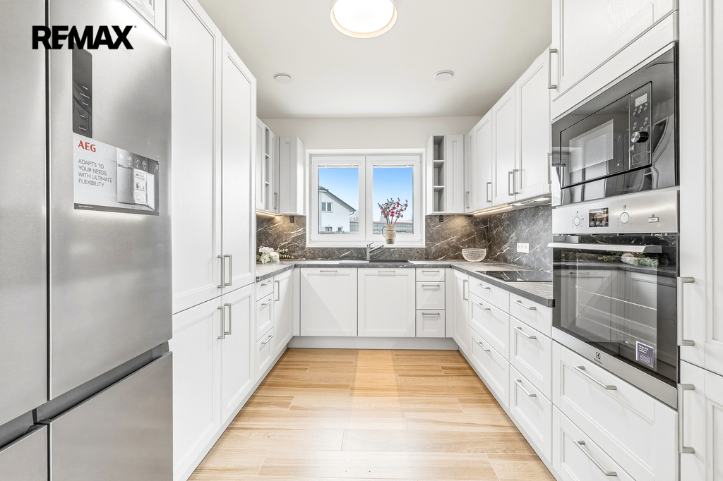 Nadstandardní vybavení v ceně: Moderní kuchyňská linka s kvalitními spotřebiči, vestavěné skříně, bezpečnostní systém Jablotron, trezor ve zdi, LED osvětlení