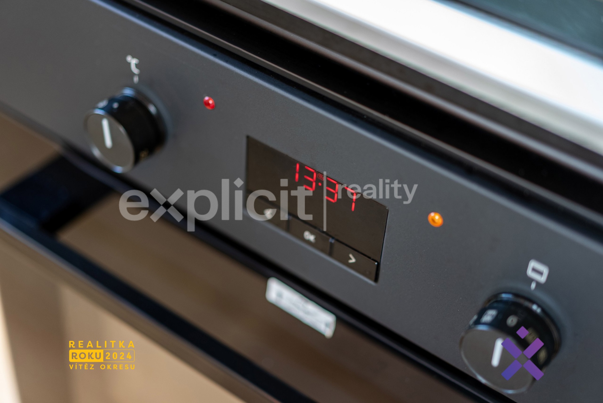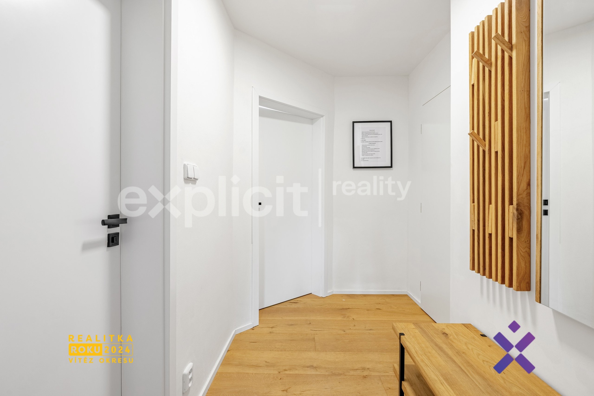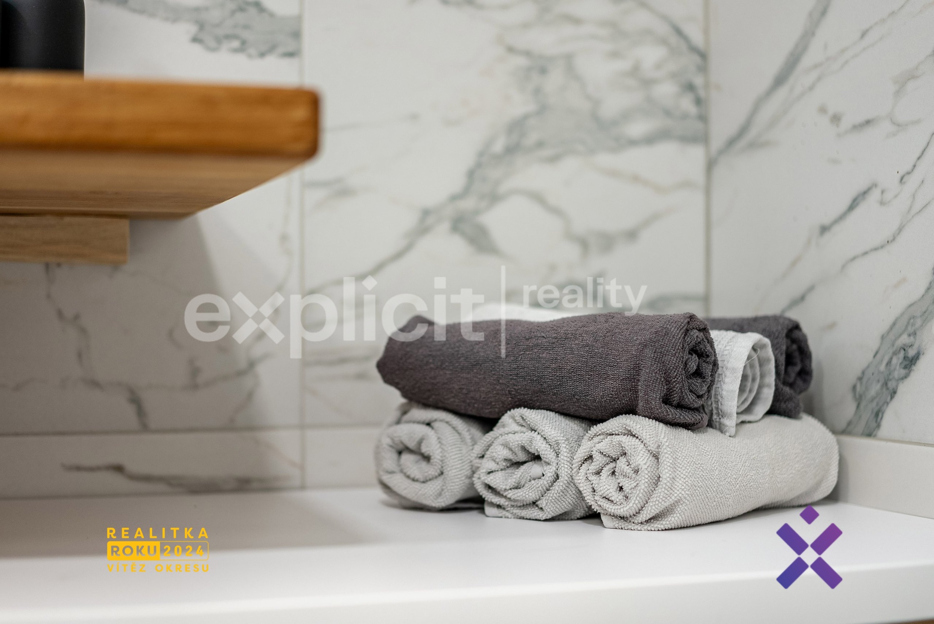 Interiér byl navržen s důrazem na moderní design a kvalitní provedení. Při rekonstrukci byly použity vysoce kvalitní materiály a celý apartmán je ve výborném, udržovaném stavu. Podlaha je vyrobena z masivního dubového dřeva. Dům, ve kterém se apartmán nachází, prošel kompletní rekonstrukcí před dvěma lety, je zateplený a společné prostory jsou ve výborném stavu díky aktivnímu fondu oprav.