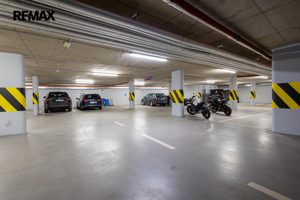 Dům má vysoký standard zabezpečení – vstup do budovy, výtahu i garáží je možný pouze na čip. K bytu náleží také soukromé parkovací místo přímo v domě, což je v této lokalitě velkou výhodou.