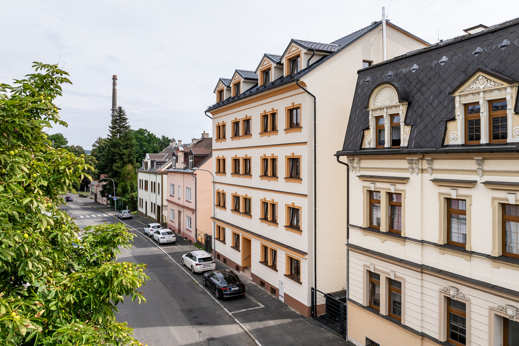 Dispozice bytu je velmi praktická. Ze vstupní předsíně je samostatný vstup do všech místností, a to do obývacího pokoje s kuchyňským koutem, ložnice, dětského pokoje, komory, koupelny a na samostatné WC. Z obývací části je přímý vstup na zasklenou lodžii, která nabízí krásný výhled na centrum města a široké okolí. Díky zasklení je možné lodžii pohodlně využívat i v chladnějších měsících. Velkorysé úložné možnosti nabízí podkrovní prostor přístupný po skládacích půdních schodech přímo z bytu (není zachyceno na fotografiích). K bytu náleží zděná sklepní kóje (2 m²) v suterénu domu.