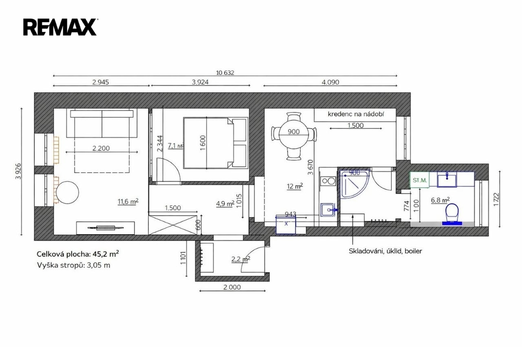 - Celková podlahová plocha: 44 m²