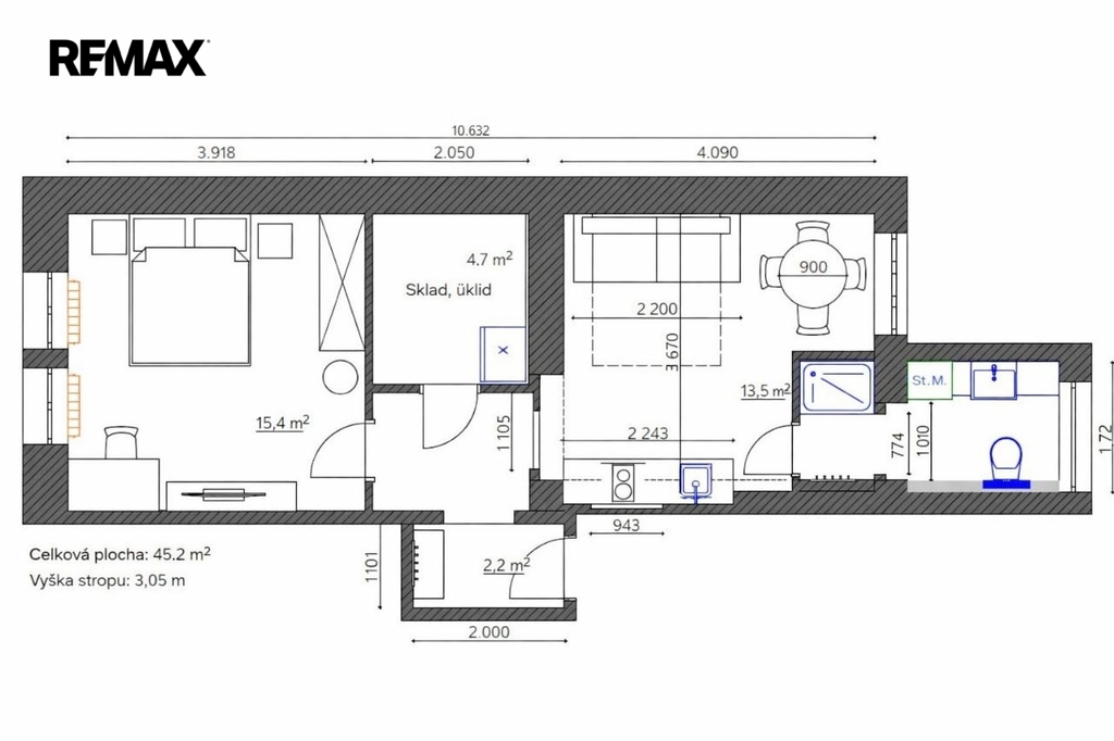 | Dispozice/podlahová plocha: | 2+kk/44 m² |