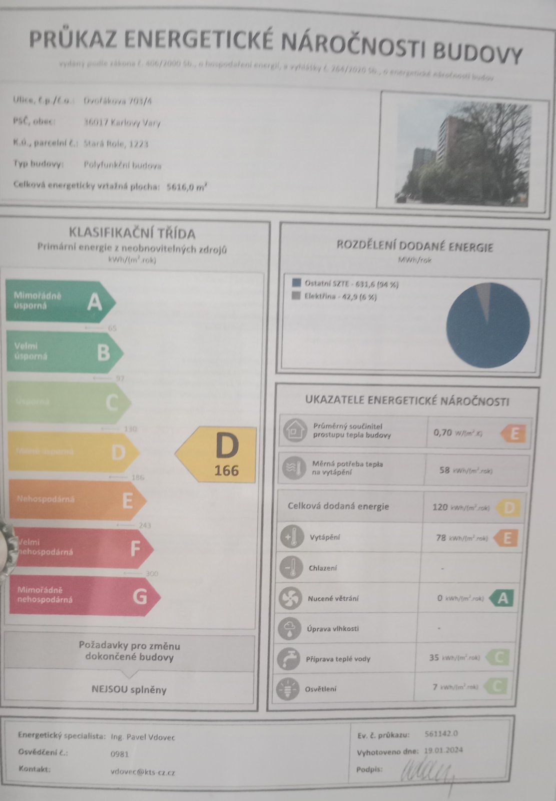 - Ukazatel energetické náročnosti budovy: 166 kWh/m²