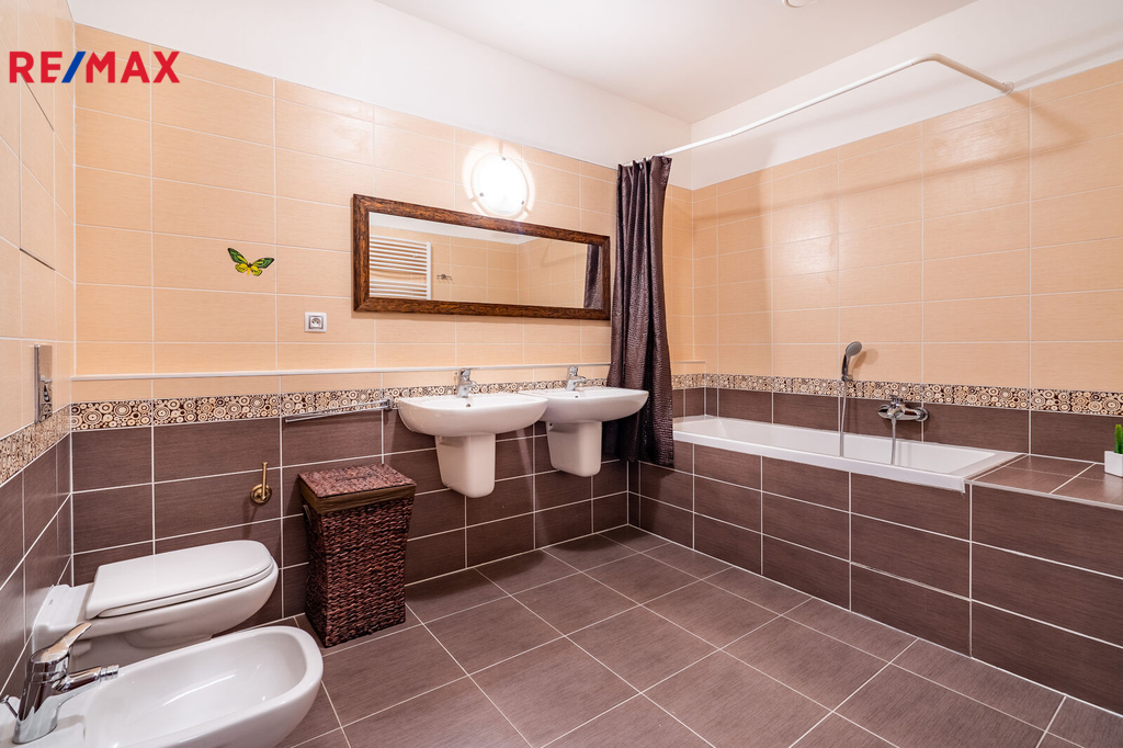 Byt je vybaven moderní koupelnou s kvalitními zařizovacími prvky a dvěma samostatnými toaletami, což ocení zejména vícečlenné domácnosti. Celý interiér je kompletně zařízen, což znamená, že si stačí přinést osobní věci a můžete se ihned nastěhovat. Nábytek i spotřebiče jsou pečlivě vybrané tak, aby odpovídaly současným trendům a poskytovaly maximální funkčnost i estetiku.