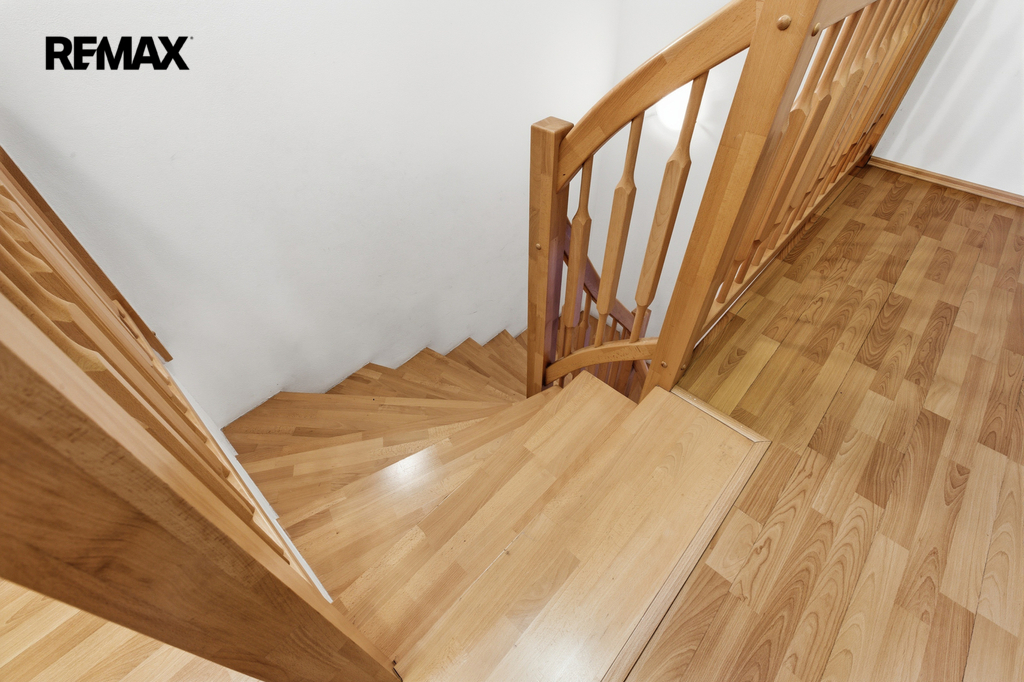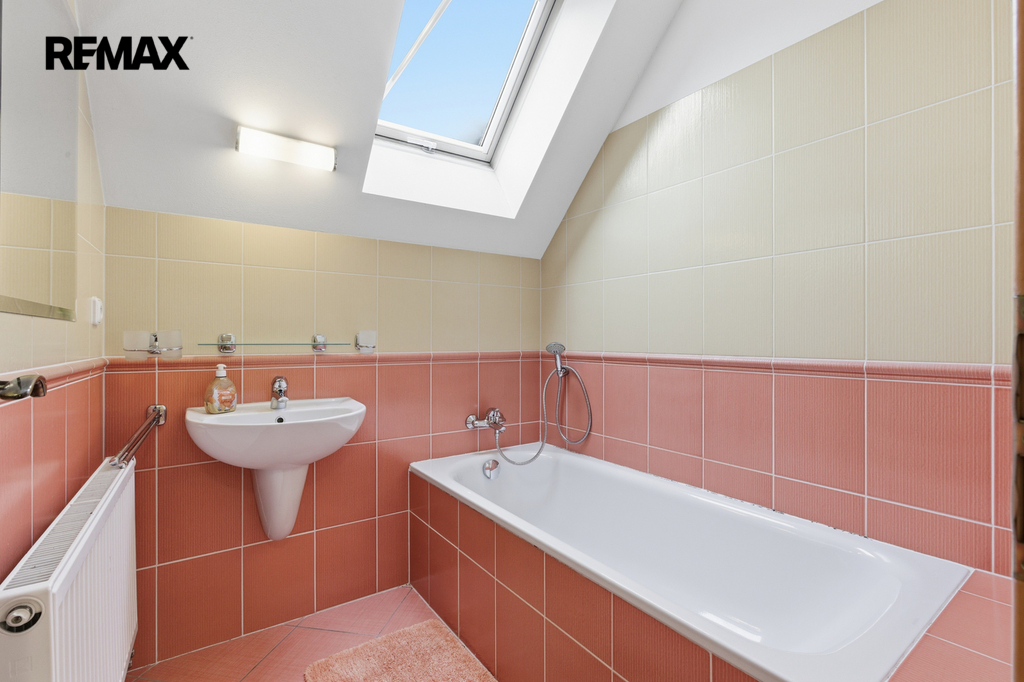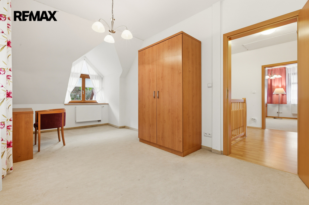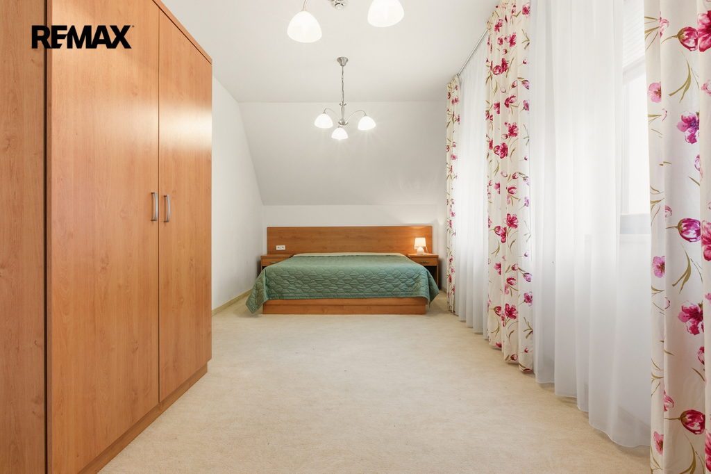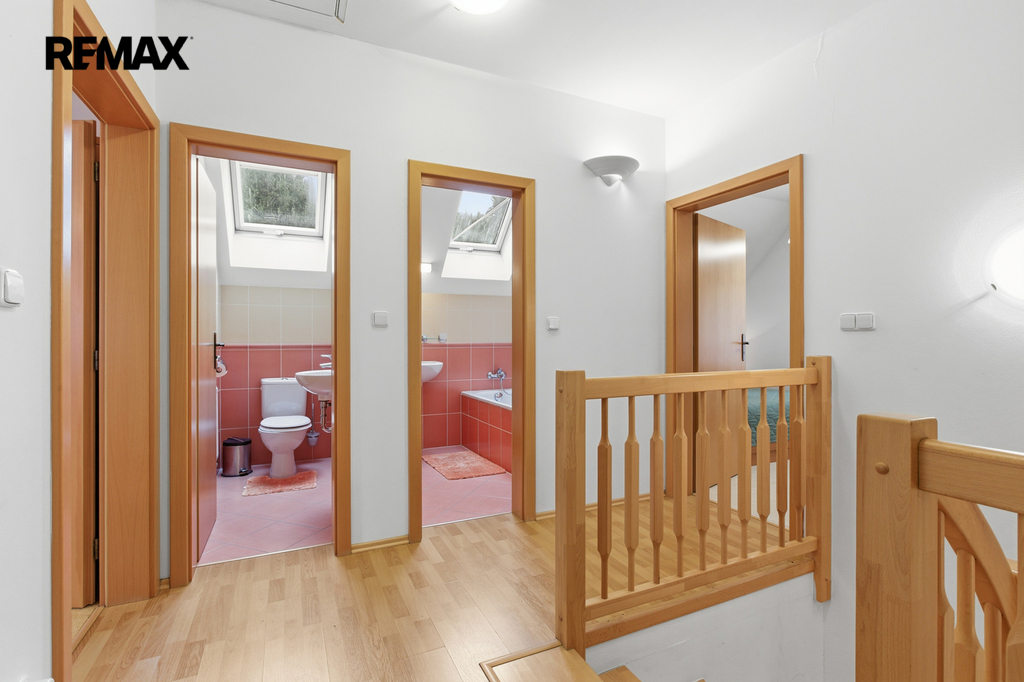 V patře jsou umístěny dvě komfortní ložnice, další koupelna s vanou a samostatná toaleta.