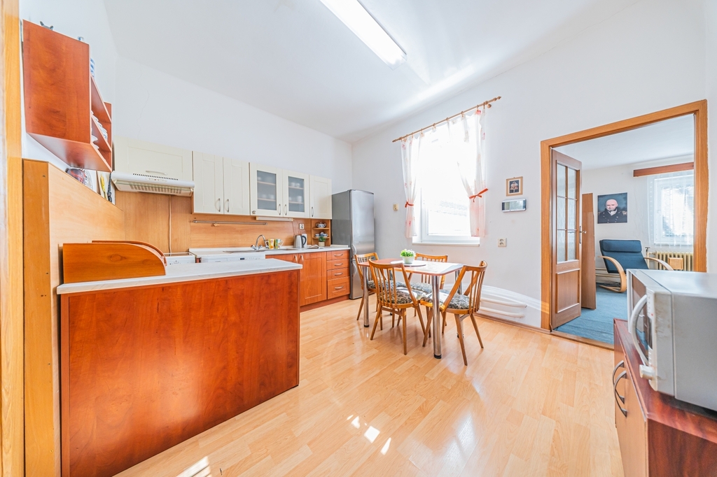 Horní podlaží prošlo kompletní moderní rekonstrukcí a nabízí vysoký standard bydlení. Nachází se zde obývací pokoj s velkým francouzským oknem se vstupem na terasu. Její orientace je jihozápadní a je vybavena zatahovací markýzou. Další obytný prostor je řešen jako otevřený celek propojující obývací část s kuchyňským koutem a jídelnou. K dispozici je ložnice s navazující šatnou, koupelna s WC, praktický kumbál a schodiště do podkroví, kde se nachází další ložnice. Vytápění a ohřev teplé vody zajišťuje plynový kotel Dakon se zásobníkem, v celém podlaží, kromě ložnice je podlahové vytápění řízené termostatem. Toaleta je řešena závěsným systémem Geberit. Interiér doplňují sádrokartonové podhledy a moderní kuchyňská linka se sklokeramickou deskou Schott Ceran, troubou Whirlpool a digestoří.