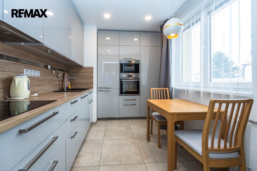 Kuchyň je plně vybavená a to včetně indukční desky, trouby, mikrovlnky, myčky na nádobí a lednice. V bytě zůstává veškerý nábytek na fotografiích.