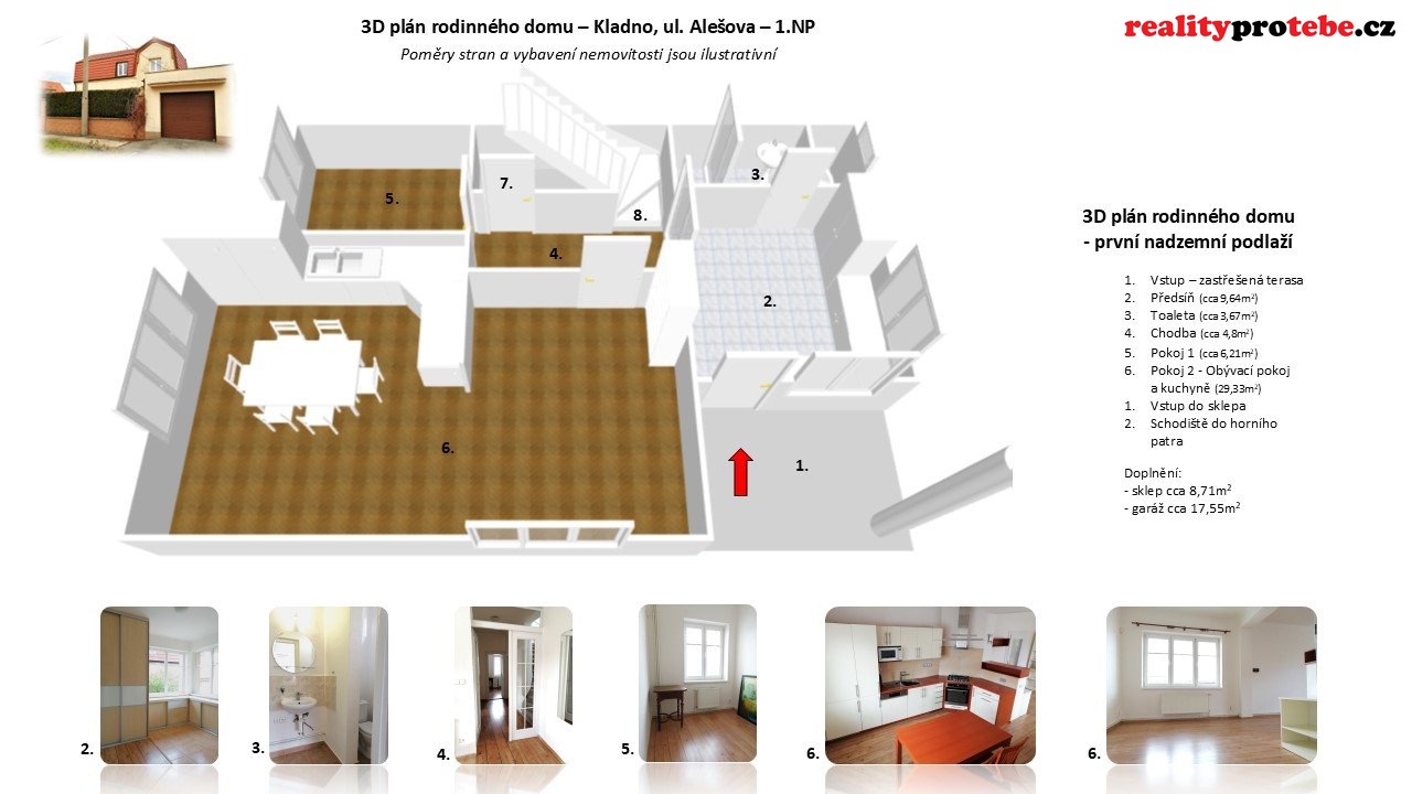 Přízemí rodinného domu tvoří vstupní hala s následným vstupem do spodní toalety (s umyvadlem a přípojkami na pračku) a propojovací chodby. Z chodby je přístup do menšího pokoje a do obývacího pokoje spojeného s moderně vybavenou kuchyní s vestavnými spořebiči (pečící trouba, myčka, atd.). a základním nábytkem (stůl a židle). Z chodby je dále vstup na schodiště do horního patra a do sklepa. Horní patro nabízí koupelnu s vanou a toaletou a tři samostatné pokoje. Z horního patra je také přístup do menšího půdního prostoru, který je možno využít k uložení ne často využívaných věcí a krabic.