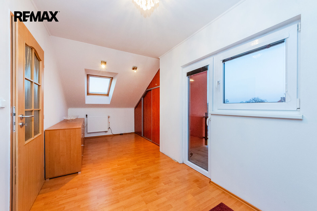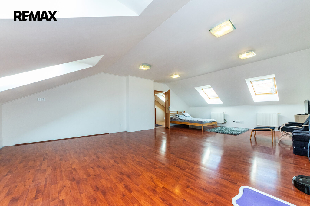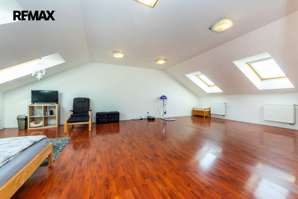 Podkroví: prostorný obytný prostor s přípravou na kuchyň, ložnice s lodžií, koupelna se sprchovým koutem a toaletou, střešní okna Velux zajišťující dostatek denního světla