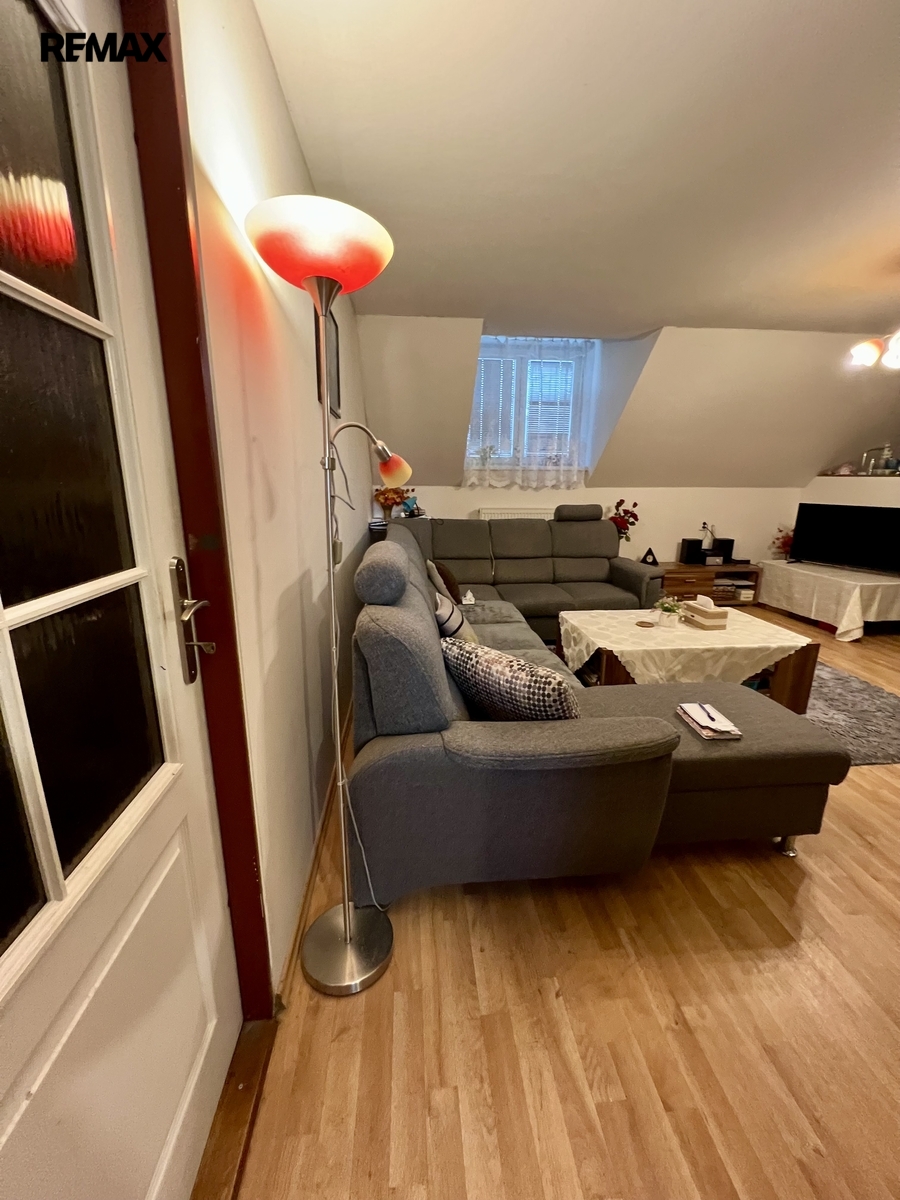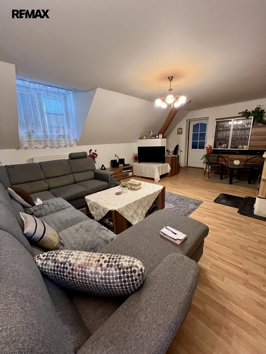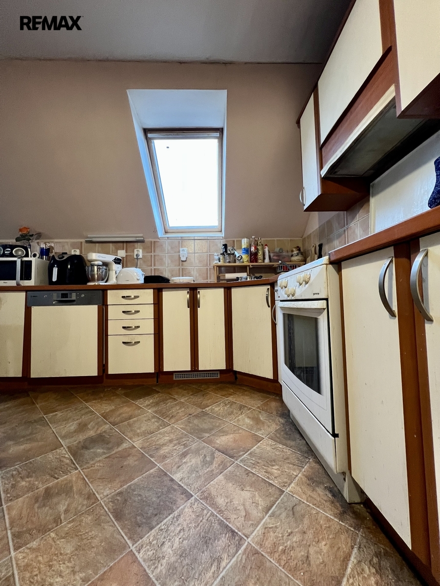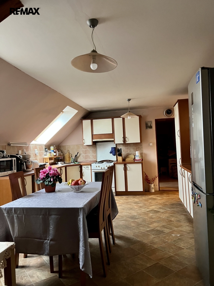 V patře vznikla při rekonstrukci v roce 2007 prostorná bytová jednotka o velikosti cca 140 m². Nabízí světlý obývací pokoj, velkou kuchyň s jídelnou, dva pokoje, koupelnu, šatnu i balkon. Díky tomu můžete bydlet ihned a spodní část domu postupně přizpůsobit svým představám.