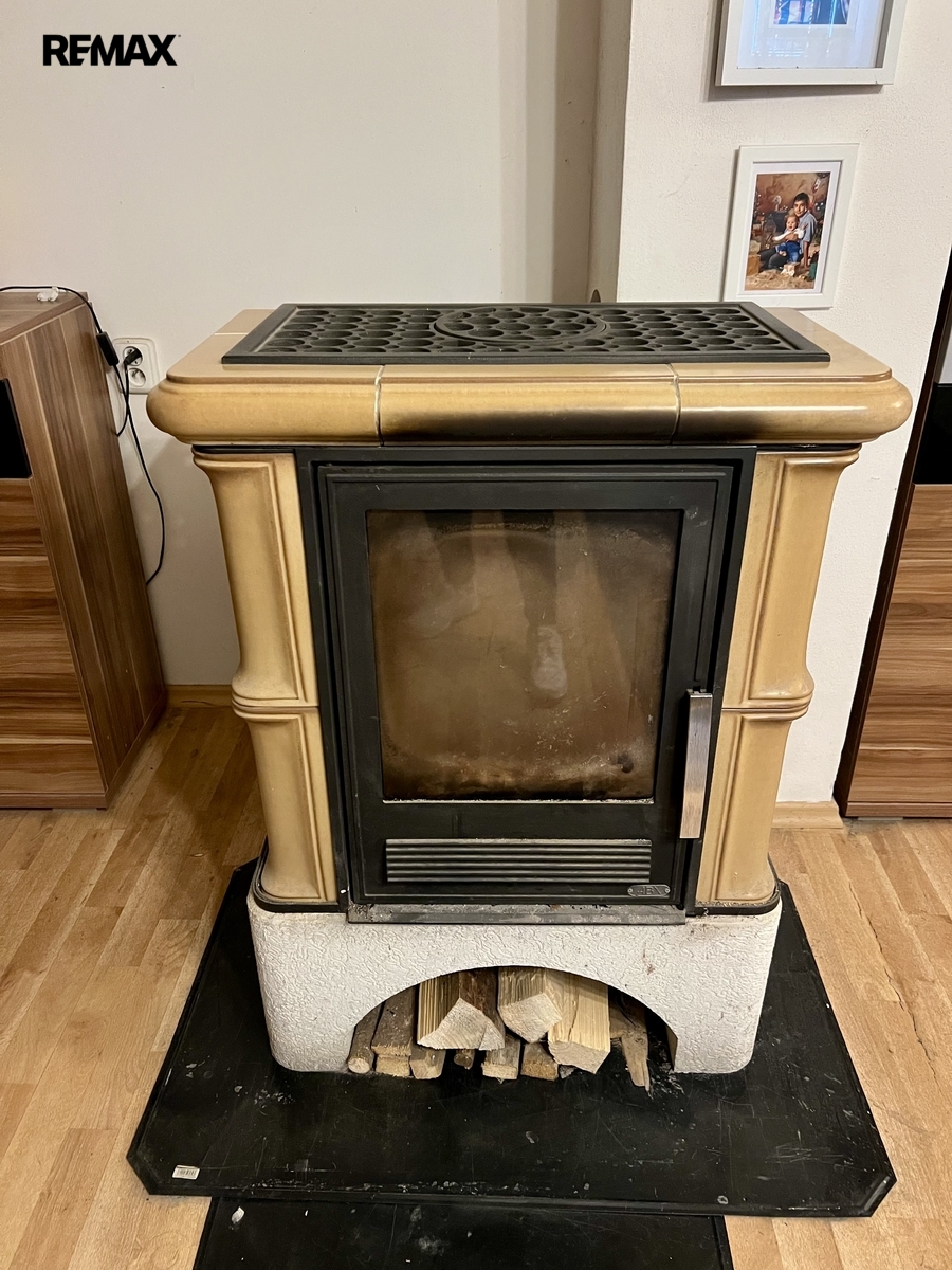 Dům je vytápěn plynovým kotlem, podkroví je zateplené a okna jsou kombinací dřevěných a plastových.