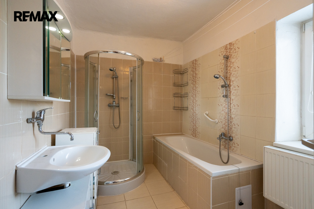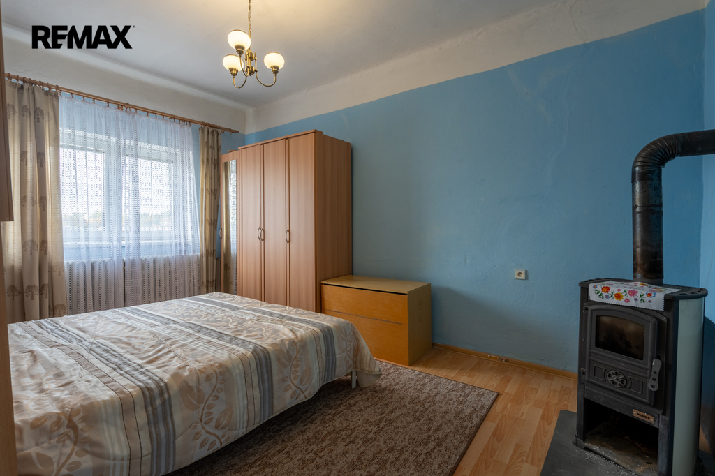 V horní části se nachází prostorná kuchyň, útulný obývací pokoj, ložnice s krbovými kamny, menší neprůchozí pokoj a další průchozí pokoj, který lze upravit podle potřeby. Koupelna je vybavena vanou, sprchovým koutem i toaletou – prostě vše, co potřebujete pro pohodlné bydlení.