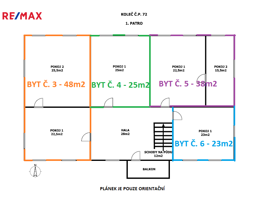 Ve 2. nadzemním podlaží je také vybudován společný balkon a je zde vstup na půdu (142 m²), kde je možné případně dovybudovat další dvě jednotky.