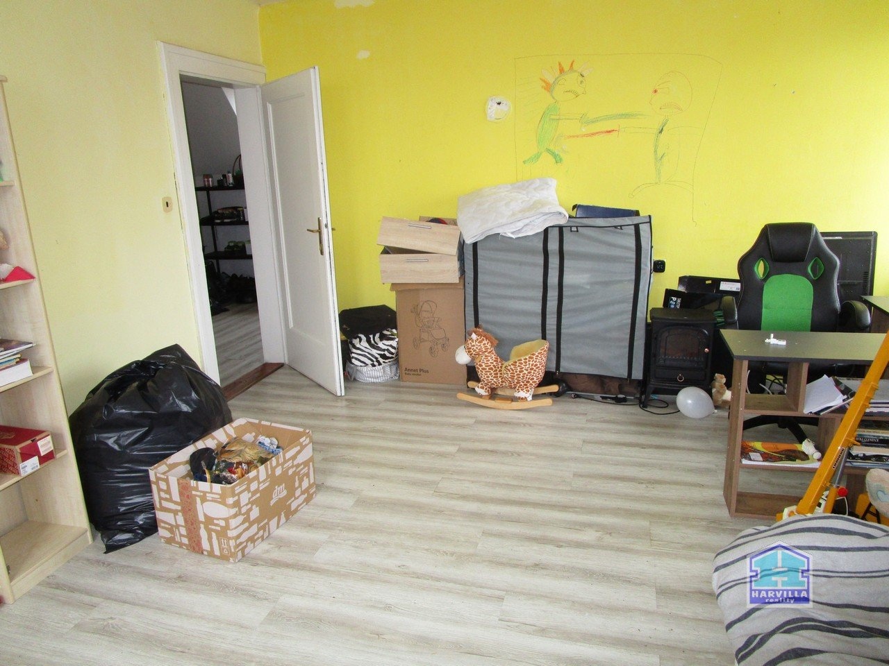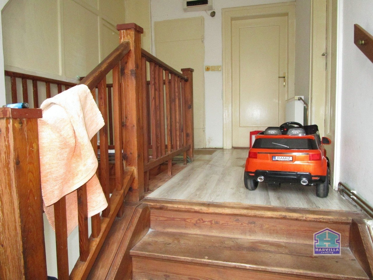 V patře je další byt se vstupní halou, ze které se dostaneme na samostatné WC a do koupelny s vanou, umyvadlem a plynovým kotlem. Z haly je dále vstup do obývacího pokoje s balkonem. Z obývacího pokoje je vstup i do ložnice.