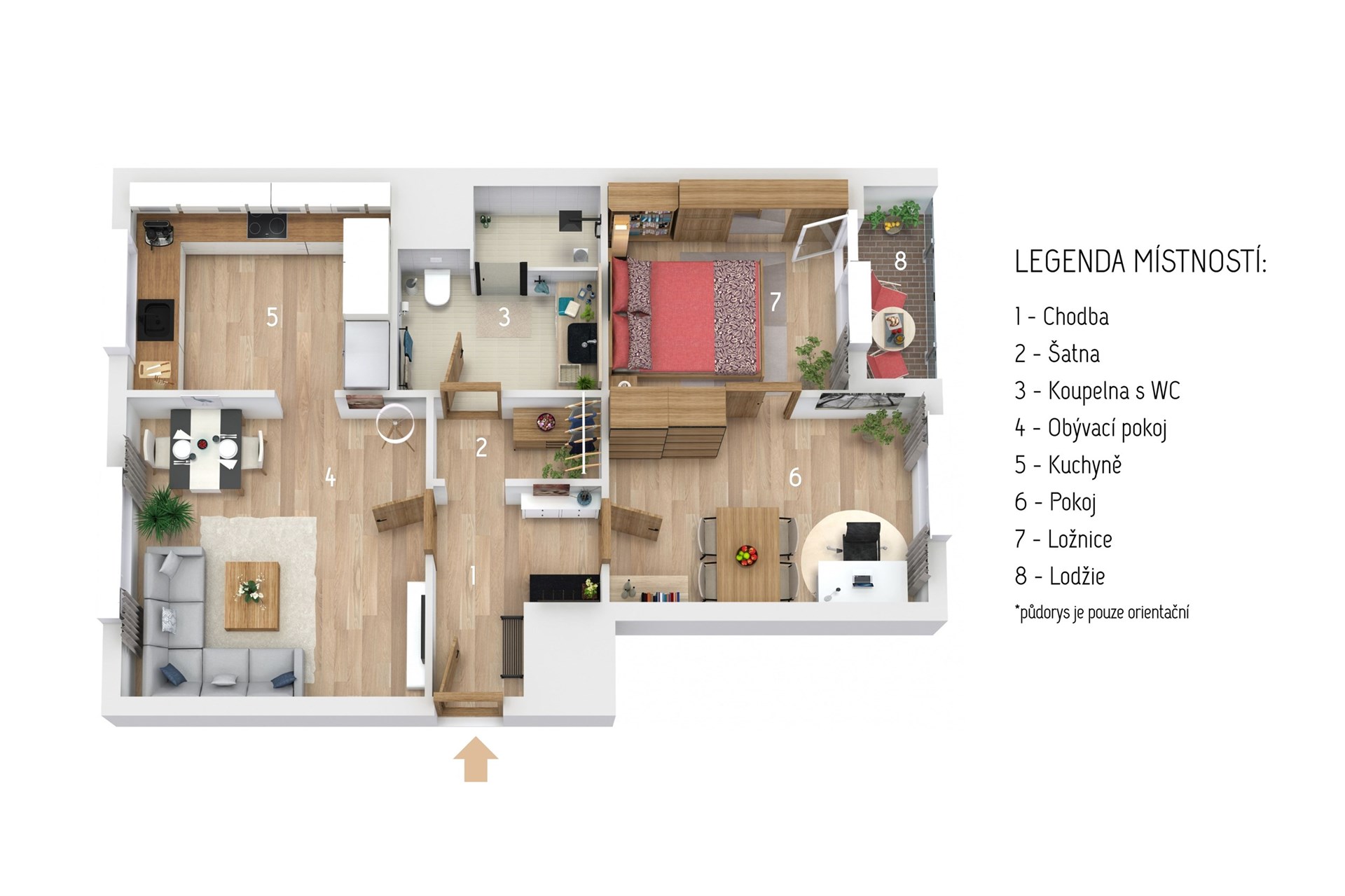 Ložnice disponuje velkým úložným prostorem a přímým vstupem na lodžii. Další pokoj může sloužit jako dětský pokoj, pracovna či pokoj pro hosty. Koupelna je nadstandardně řešená – moderní sprchový kout, prostorné úložné plochy, pračka a elegantní přírodní design. Součástí bytu je také menší šatna a velká vstupní hala s úložnými prostory.