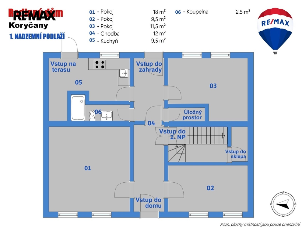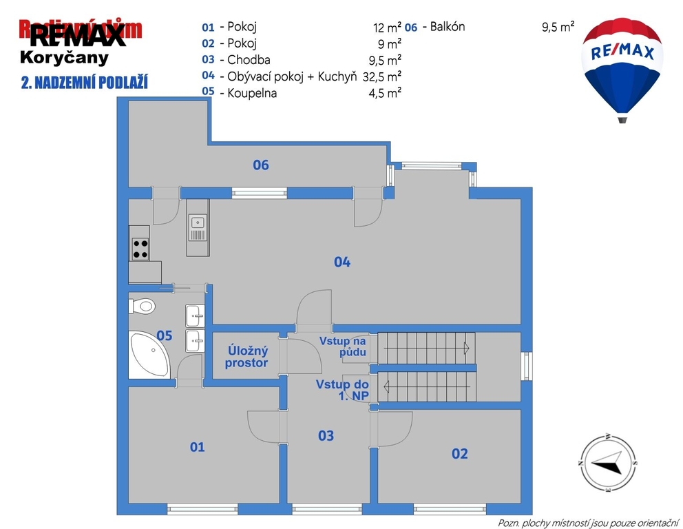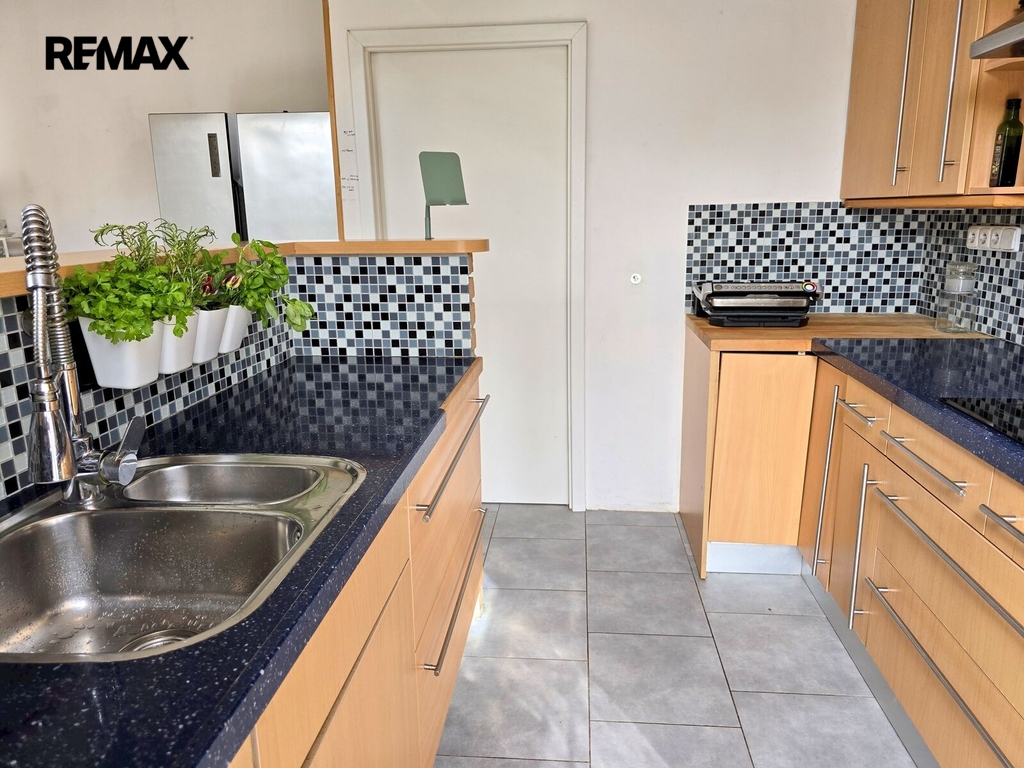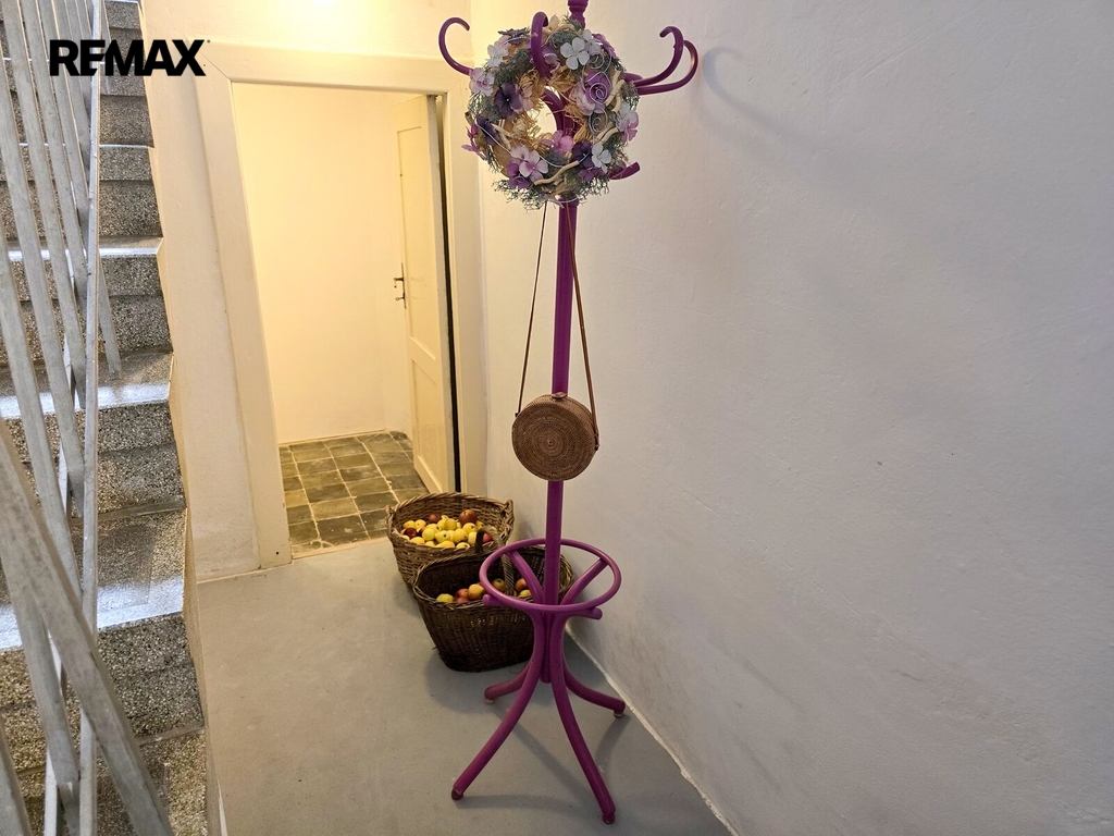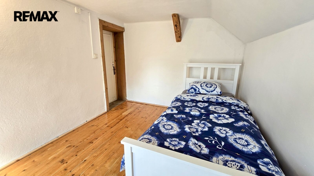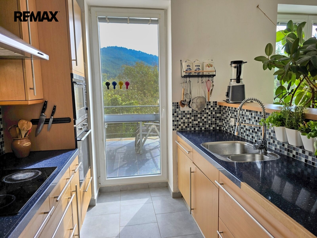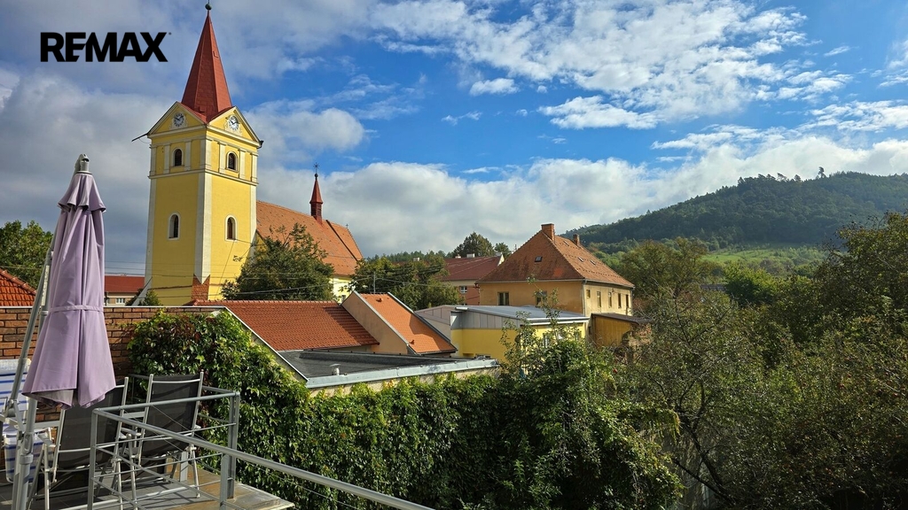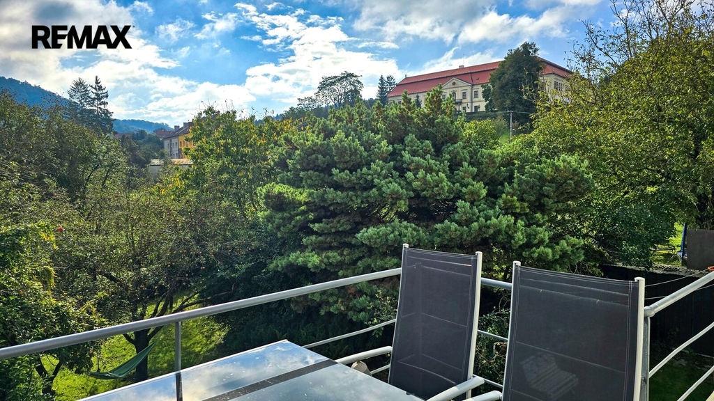 V patře je druhá bytová jednotka 3+kk s terasou a krásným výhledem na zámek. Nechybí koupelna, WC ani praktická komora pro pračku a sušičku.
