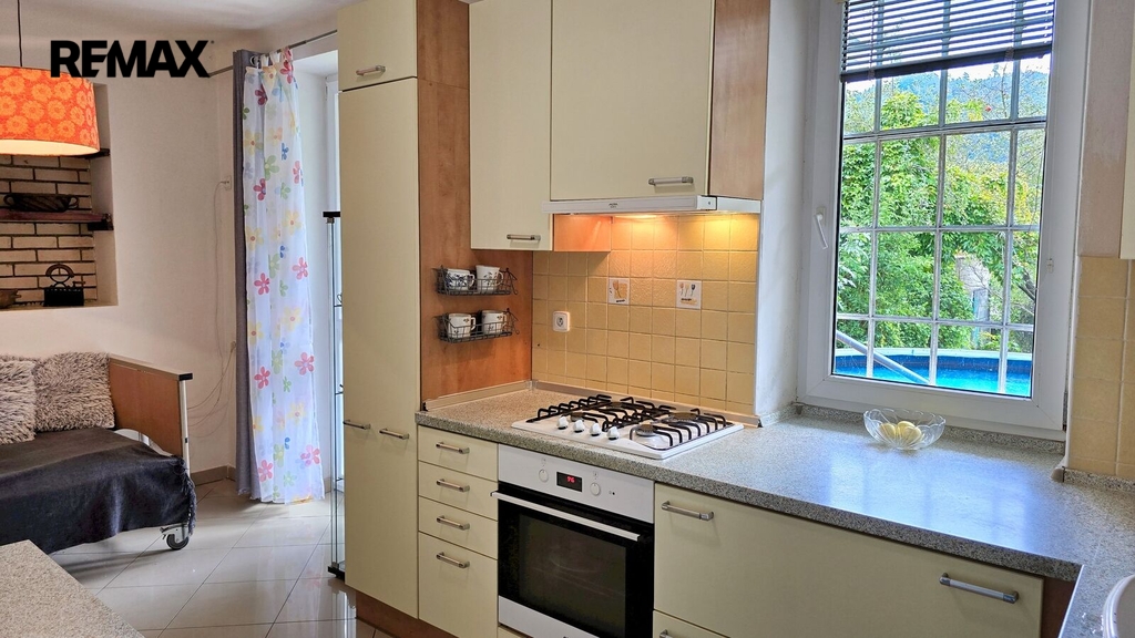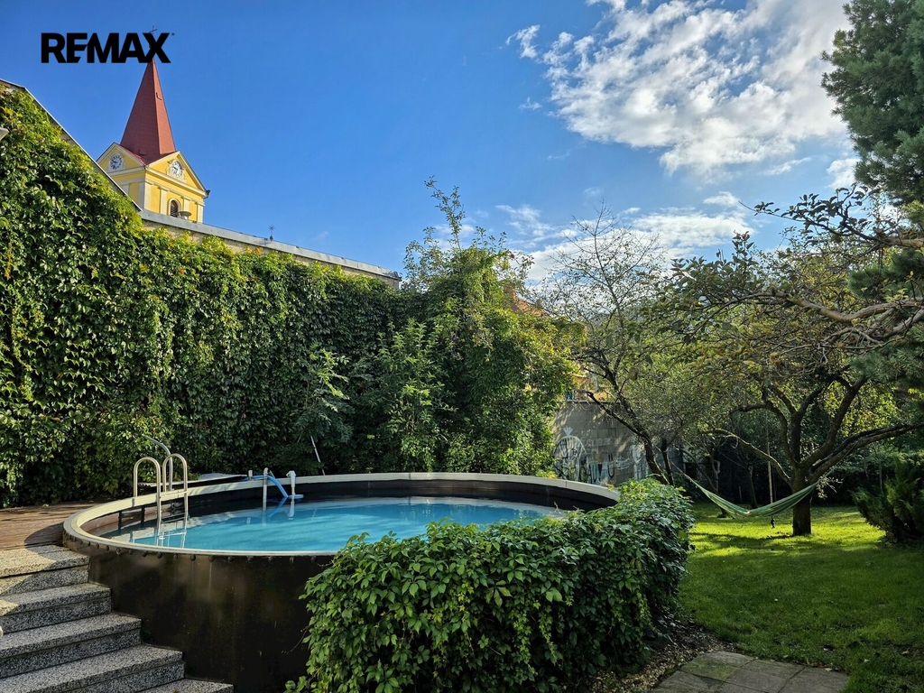 V přízemí se nachází bytová jednotka 3+1 s koupelnou a WC. Navazuje na ni terasa s bazénem – ideální místo pro letní dny, dětské hry i rodinné grilování.
