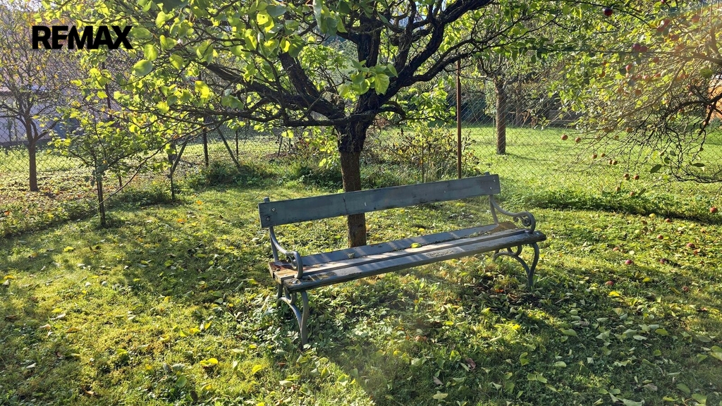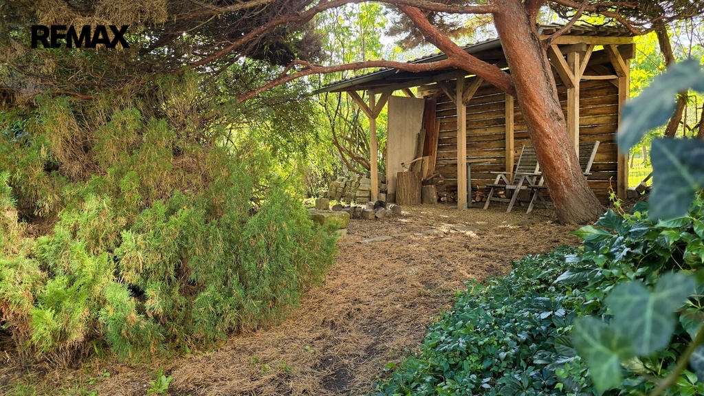 Dům má prostornou půdu, garáž, dřevník a zahradní přístřešek.