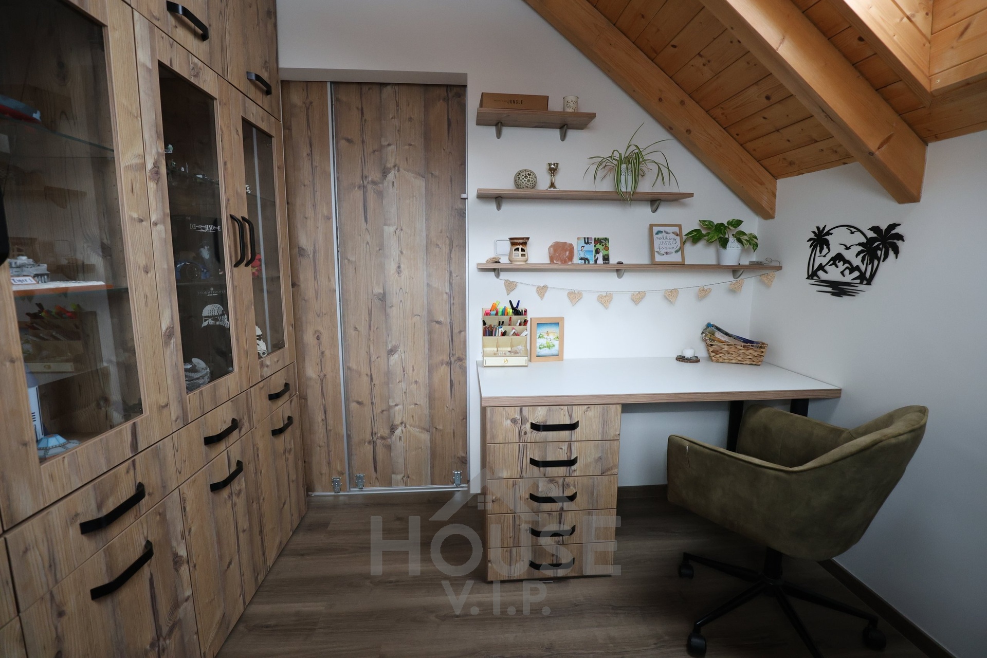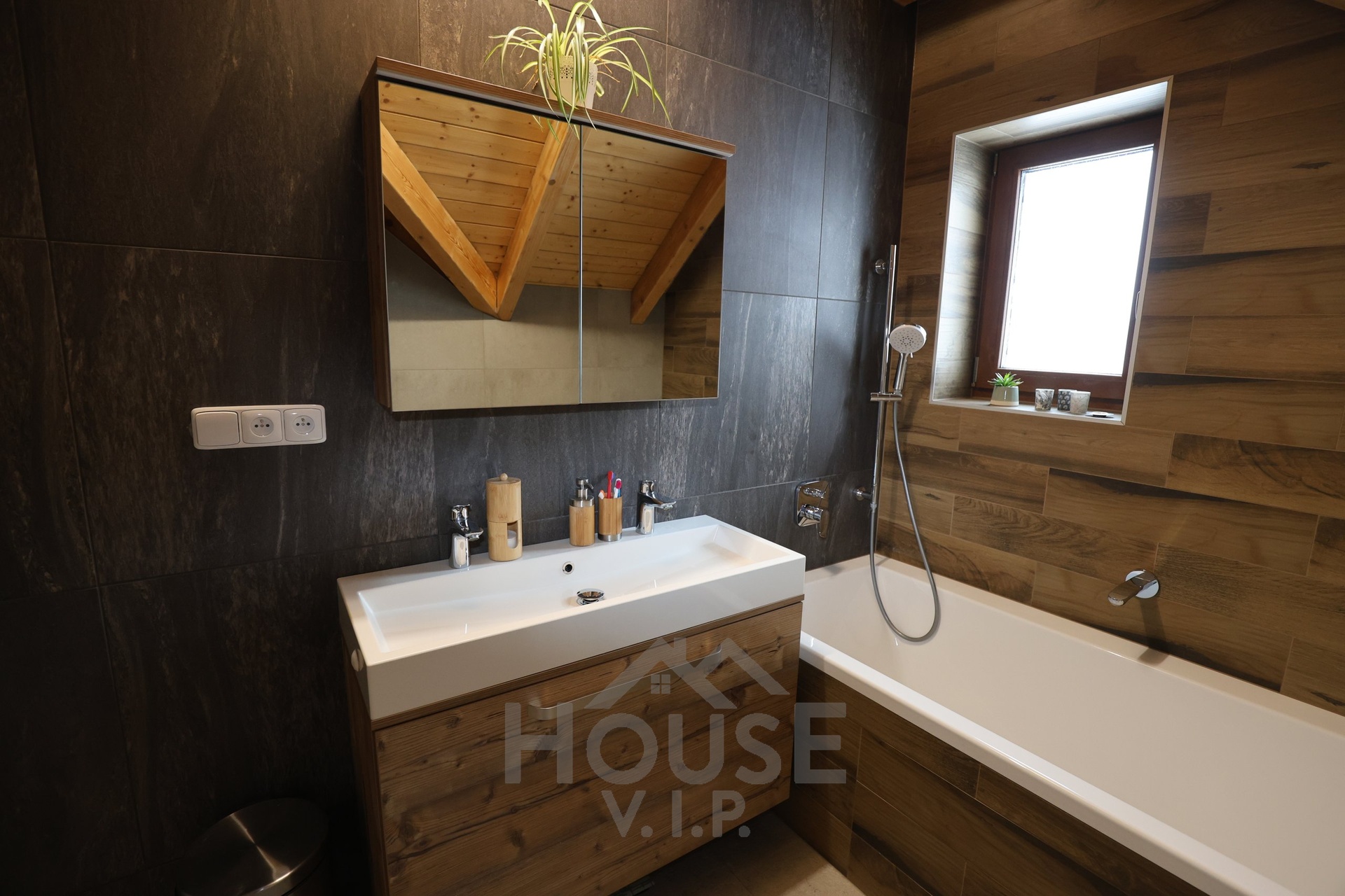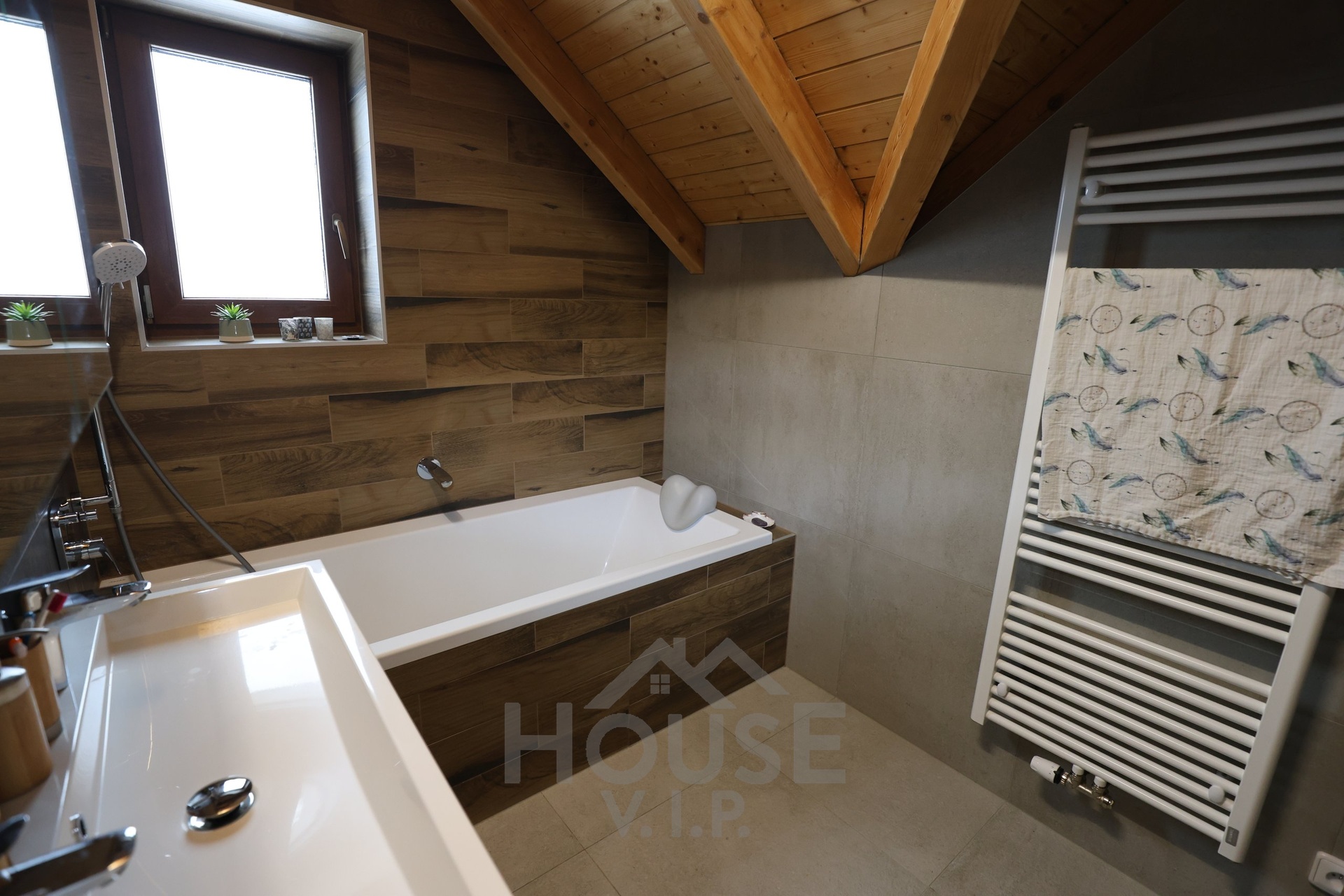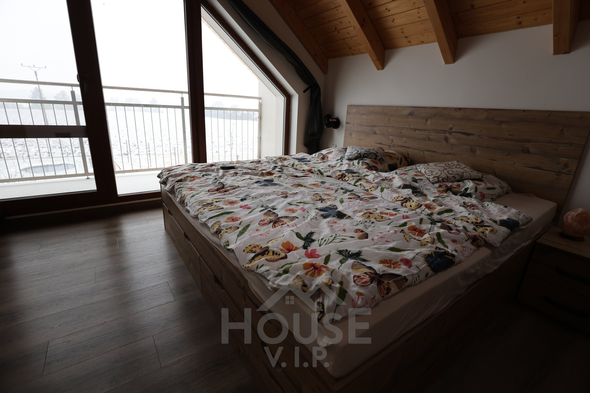 Interiér domu je laděn do teplých přírodních odstínů dřeva a působí velmi útulně. Většina nábytku byla vyrobena truhlářem na míru a je součástí prodejní ceny. Užitná plocha domu činí přibližně 132 m², dispozice je 6+kk. Dům je energeticky úsporný (PENB třídy B) s nízkými provozními náklady a je vybaven zabezpečovacím systémem Jablotron.