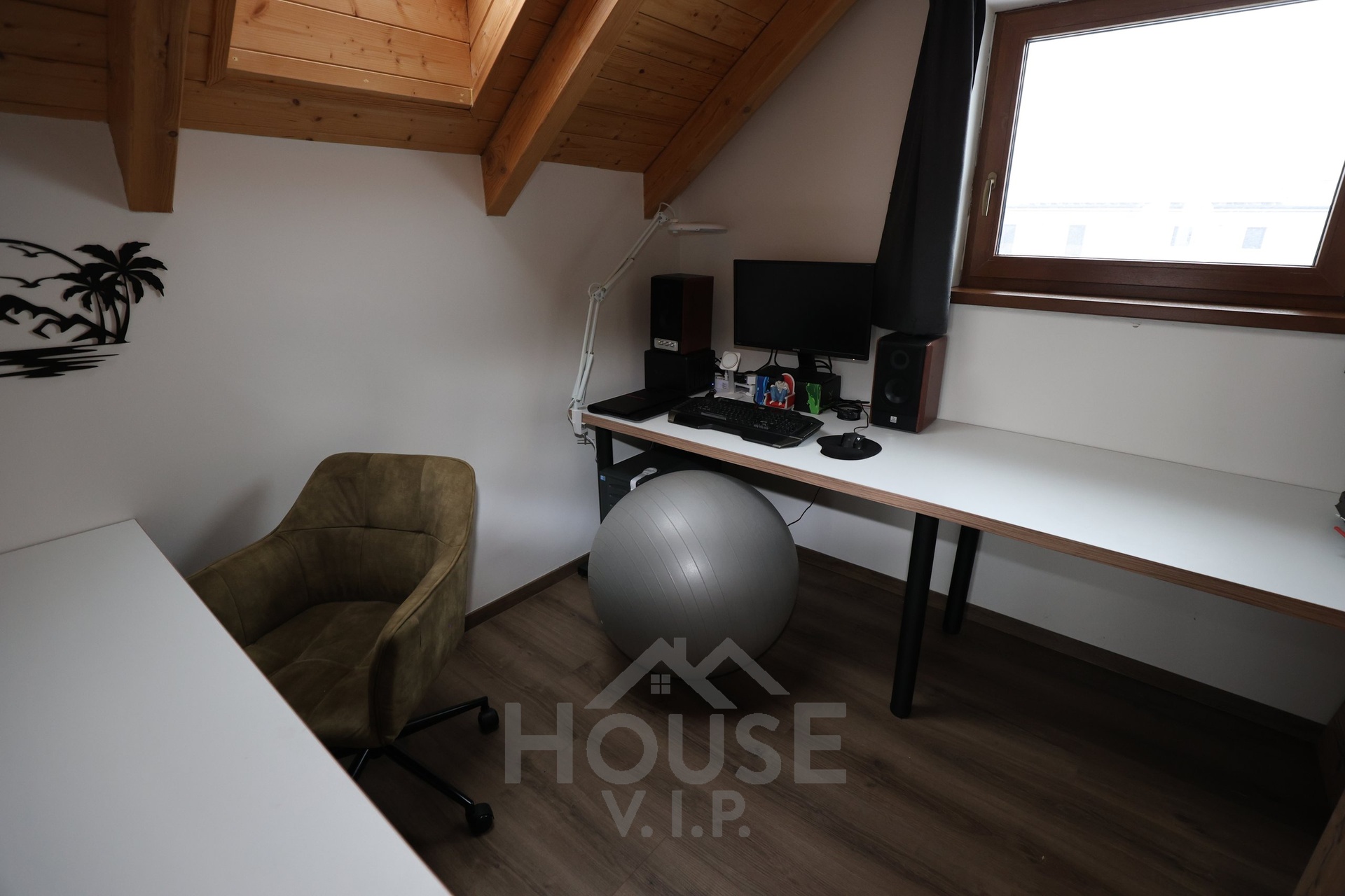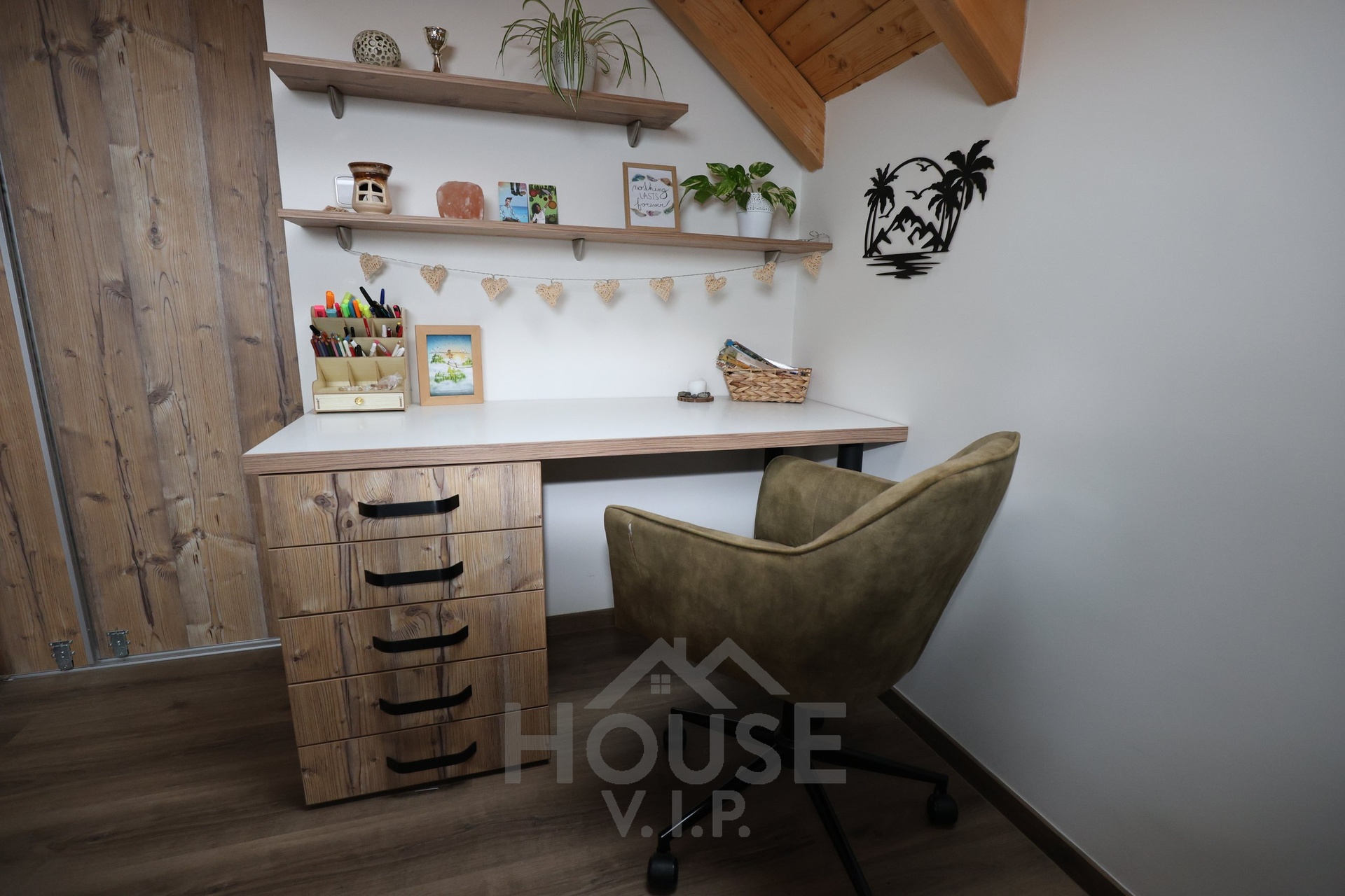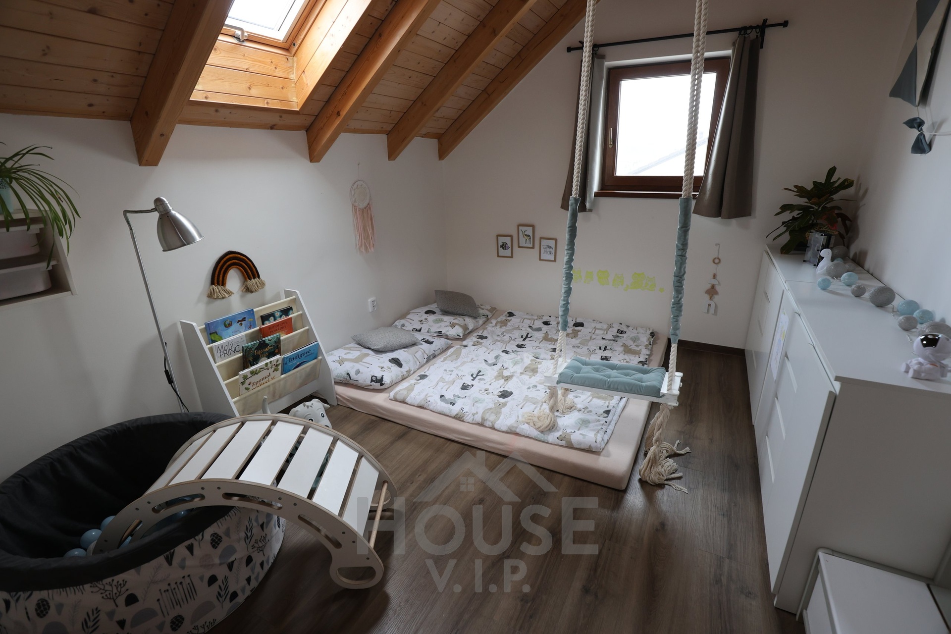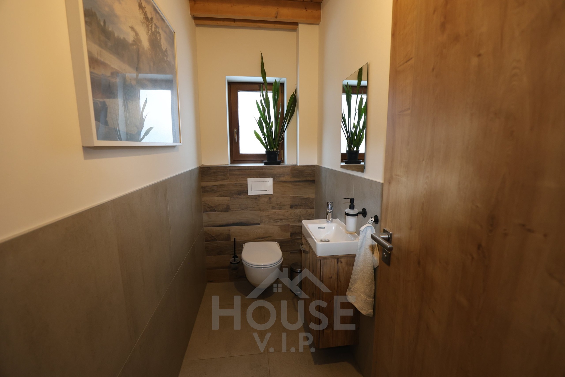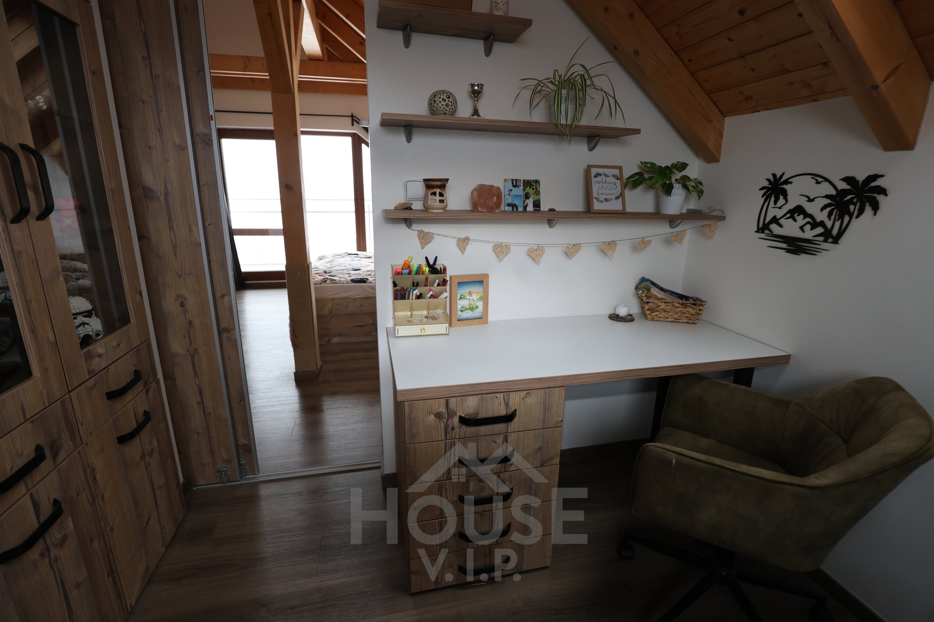 Interiér domu je laděn do teplých přírodních odstínů dřeva a působí velmi útulně. Většina nábytku byla vyrobena truhlářem na míru a je součástí prodejní ceny. Užitná plocha domu činí přibližně 132 m², dispozice je 6+kk. Dům je energeticky úsporný (PENB třídy B) s nízkými provozními náklady a je vybaven zabezpečovacím systémem Jablotron.
