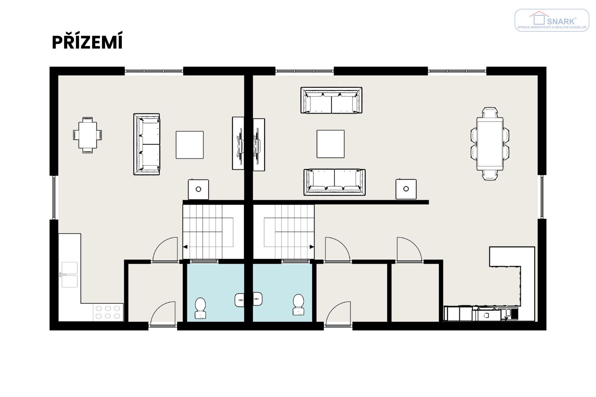 Interiér domu je promyšlený a prakticky rozdělený na dvě samostatné bytové jednotky o dispozicích 3+kk a 4+kk. Celková užitná plocha 222 m² tak nabízí flexibilní možnosti.