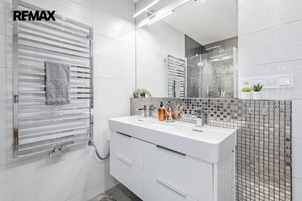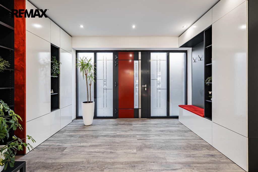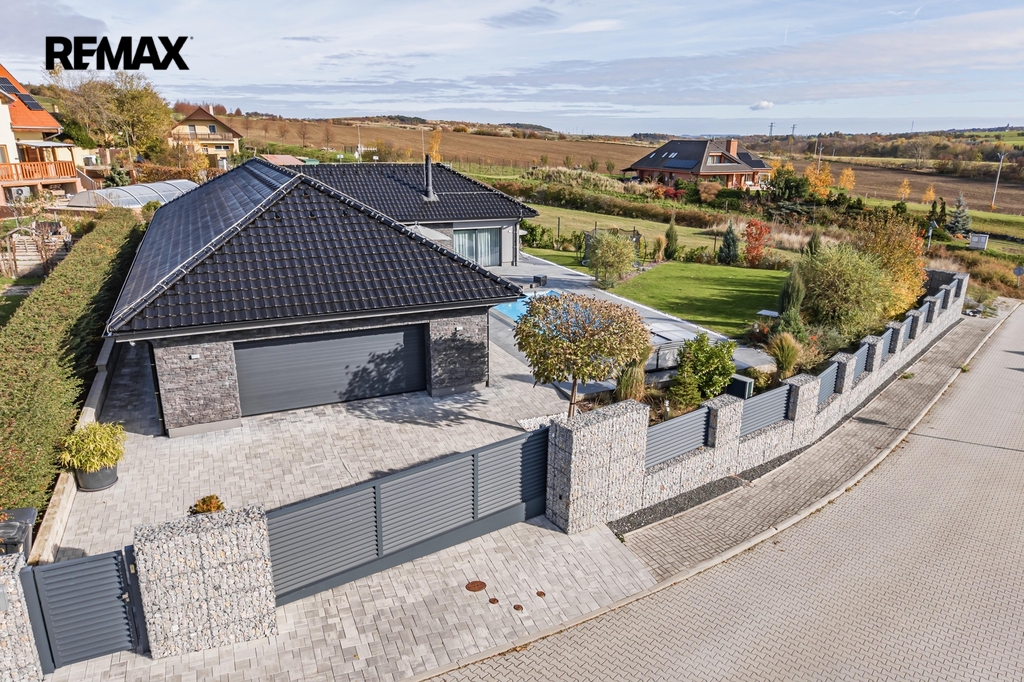 K domu náleží zahrada s okrasnými keři, vybavena závlahovým systémem a retenční nádrží pro efektivní hospodaření s vodou. Pohodlí při parkování zajistí dvojgaráž a venkovní stání, vjezd na pozemek je zajištěn automatickými vraty. Dům je zabezpečen kamerovým systémem a je připraven na instalaci alarmu a centrálního vysavače.