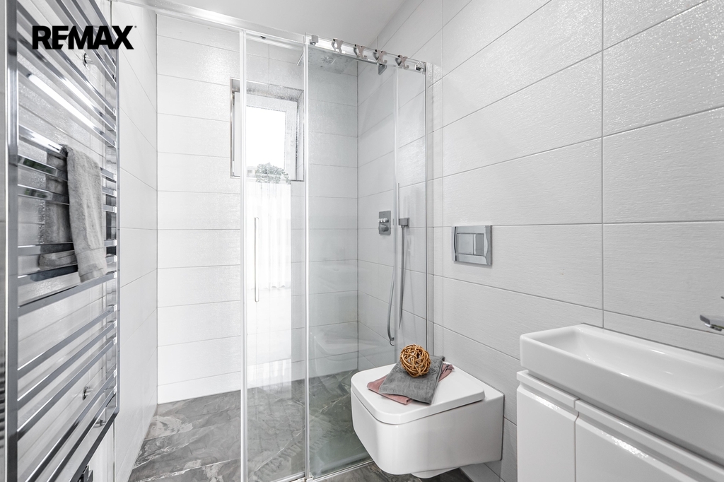 Dominantou domu je velmi prostorná místnost s přímým vstupem na terasu, která je rozdělena na obývací část s krbem a kuchyňskou a jídelní část vybavenou moderní kuchyňskou linkou se zabudovanými spotřebiči včetně myčky a americké lednice. Najdete zde tedy velký otevřený prostor ideální pro posezení s rodinou či přáteli. K pohodlí přispějí dvě koupelny a samostatná toaleta.