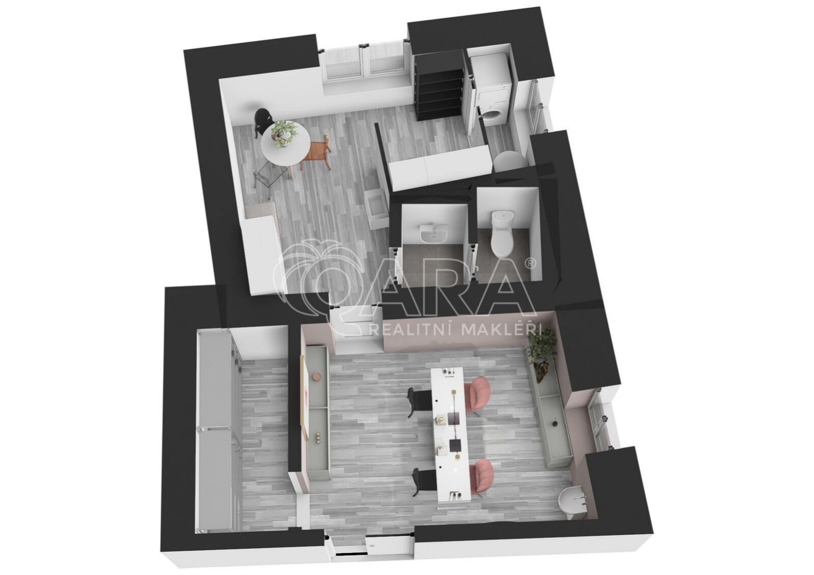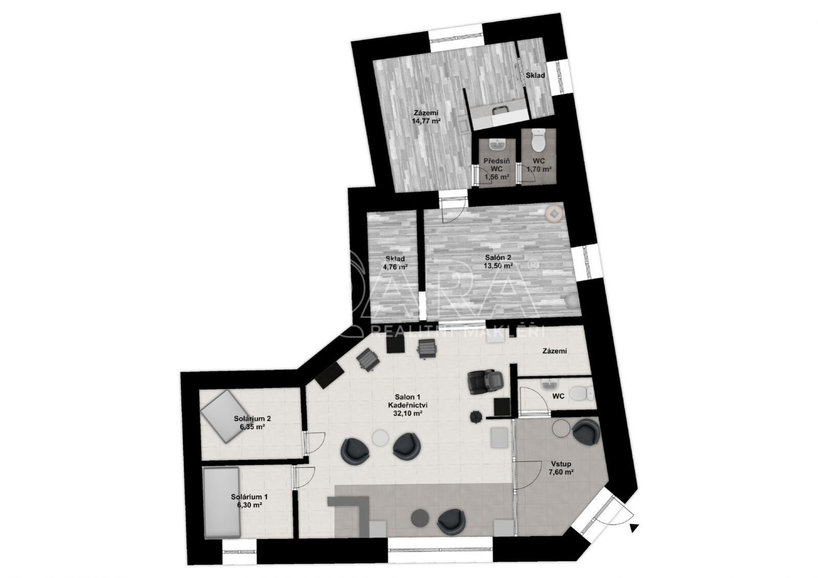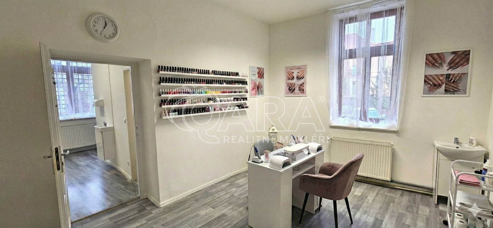 Jedná se o světlý, moderní interiér s jednou místností, který poskytuje veškeré potřebné zázemí a je součástí zavedeného salónu, kde najdete i kadeřnictví, solárium a masáže. Tento prostor je ideální například pro masážní studio nebo nehtové studio, manikúru a pedikúru, s vizualizacemi obou možností v nabídce.