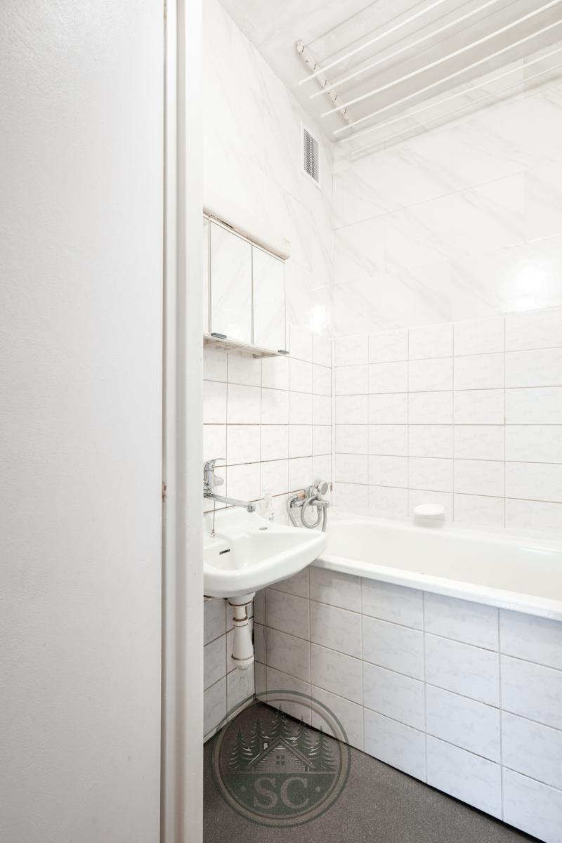 Koupelna je vybavena vanou a umyvadlem, WC je oddělené.