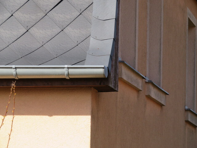je mansardová s krytinou ze šablon, opatřená klempířskými prvky – žlaby