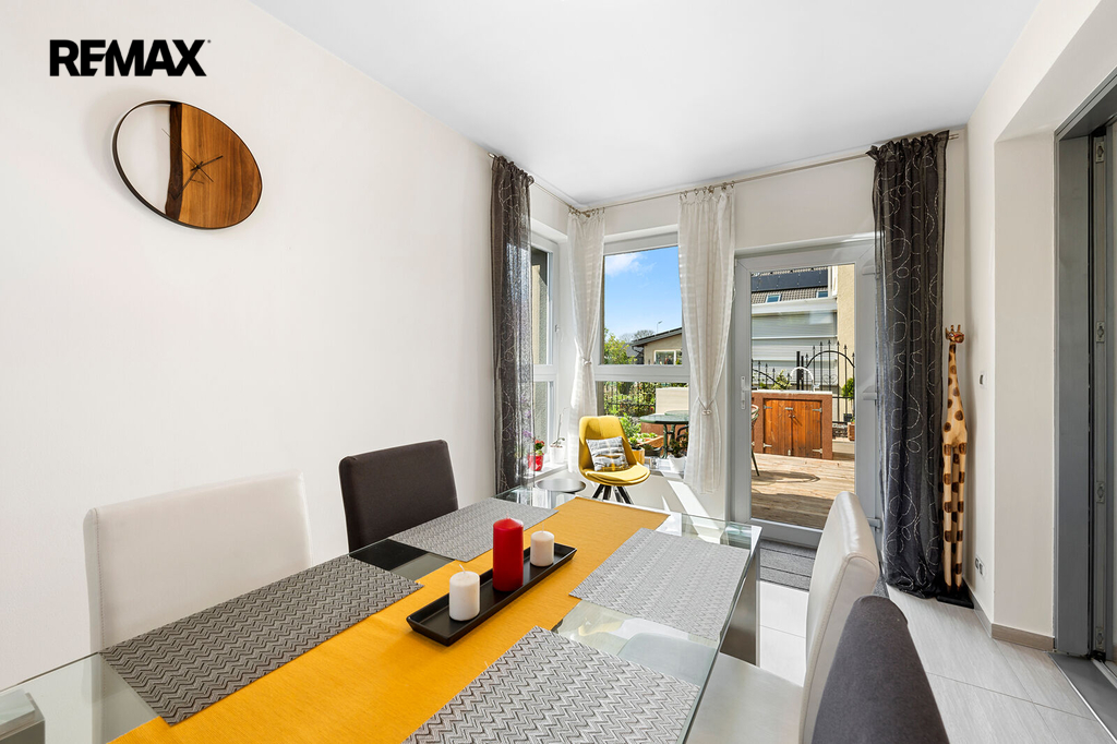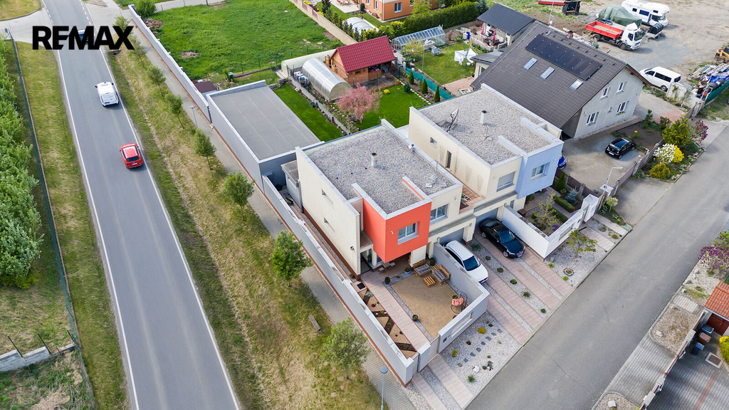 Na střeše je dostatek prostoru pro realizaci fotovoltaického systému s již hotovou přípravou resp. propojením do technické části domu. Rovněž jsou hotovy rozvody na využití centrálního vysavače. Další přidanou hodnotou jsou bezesporu dvě terasy - v přízemí navazuje na jídelní místnost se vstupem na zahradu, kde je umístěna otevřená zahradní kuchyně. V horním patře jde spíše o prostorově skromnější terasu. Obě s přímým pohledem na zahradu.