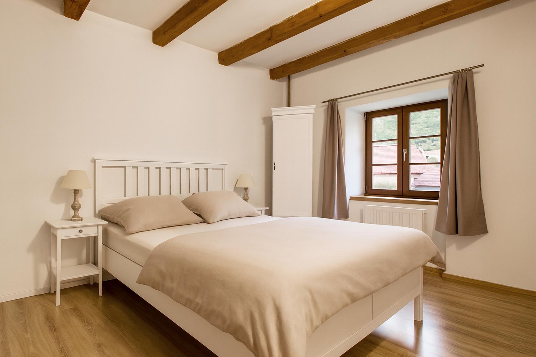 K dispozici jsou celkem 3 ložnice, půda, světlý obývací prostor s kuchyňským koutem, moderní koupelna s WC, velký prostor v přízemí s přípravou pro kuchyň, 3x WC, technické zázemí a dostatek úložných prostor. Interiér doplňují dřevěné trámy, stylové dveře a dostatek přirozeného světla díky střešním i klasickým oknům.