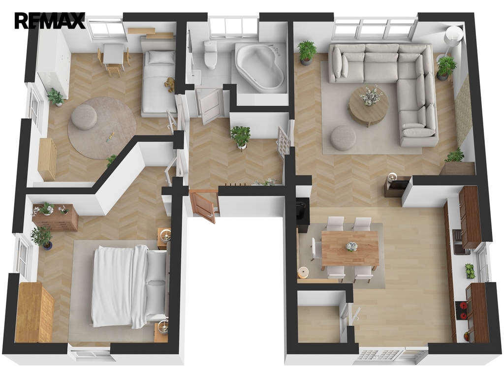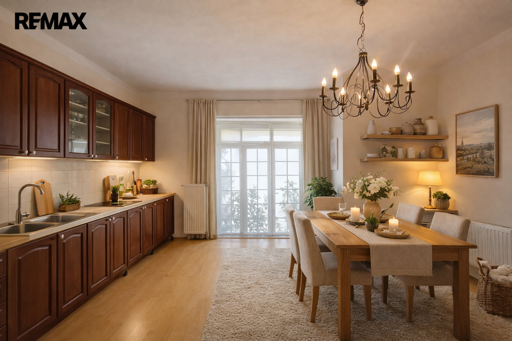 Velkou předností bytu je velkorysý prostor a praktické dispoziční řešení, které nabízí dostatek místa jak pro rodinný život, tak pro pohodlné každodenní fungování. Dominantou bytu je prostorná kuchyně s jídelní částí, kde se přirozeně setkává rodina i přátelé.