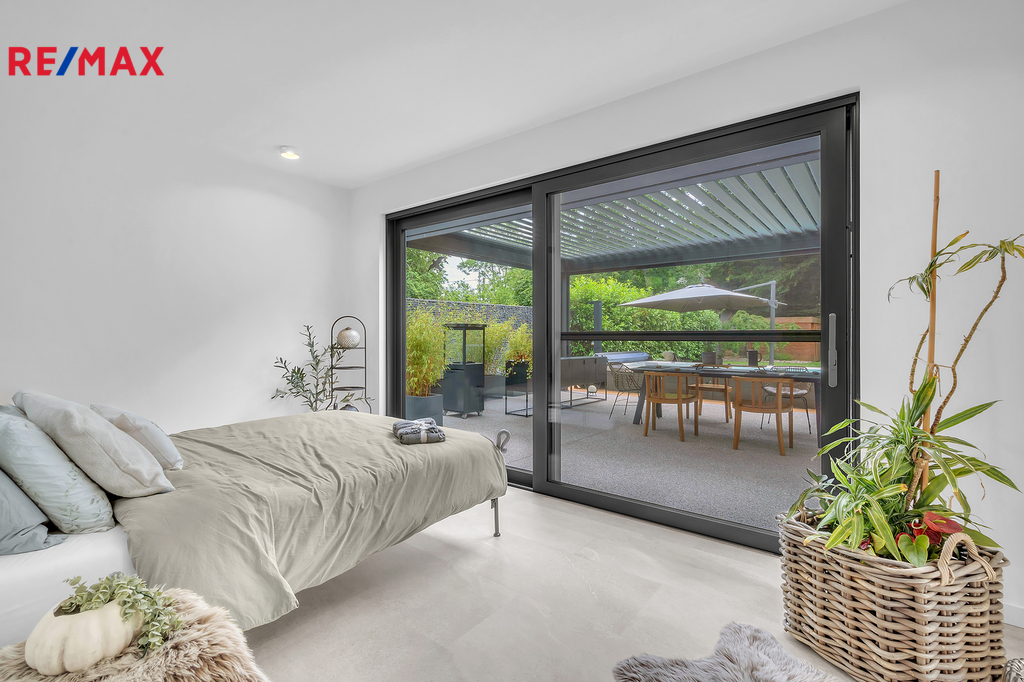 Venkovní vybavení domu – Bioklimatická hliníková pergola 24m2, s otočnými lamelami a ze všech stran opatřená dle potřeby el. roletami se senzory proti dešti a větru. Celoroční vířivka, protiproud, osvětlení, Canadian Spa zn. Mollus 10m2 s pískovou filtrací. Terasa TERAFEST premium, betony a kamenný koberec PIEDRA. Zahradní dřevěný domek 14m2 včetně regálového systému. Z poloviny pozemku oplocení GABION. Brána na el. pohon, videotelefon, 3x bezpečnostní kamera.