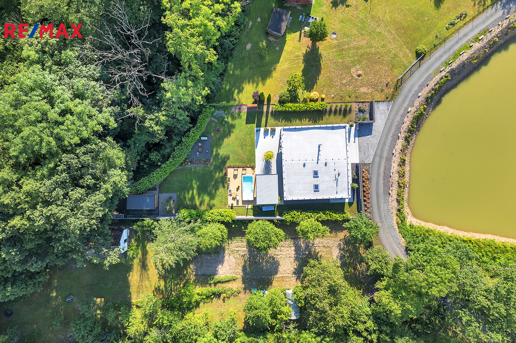 Vnitřní vybavení domu - zn. Kuchyně zn. SYKORA s pracovní deskou na míru z kamene Dekton 6cm se zapuštěným granitovým dřezem, spotřebiče Electrolux, AEG (parní trouba a vestavěný kávovar, myčka a lednice), designová digestoř ELICA. Krbová kamna STORCH VULSINI s přisáváním vzduchu, nerezový komín tříplášťový, el. regulace. Jídelní stůl masiv a židle zn. TON, dub. Značková osvětlovací tělesa INTRO LUCE na d.o.. Dveře zn. SAPELI elegant, bezfalcové provedení se značkovým kováním zn. TUPAI DEDOS. Na chodbě a v ložnici nábytek na míru zn. SYKORA. Koupelna SOLITÉR, HANSGROHE, PURAVIDA a ALESSI. Vypínače a zásuvky zn. ROON dotykové. Vnitřní parapety žulové. Podlahy jsou v kombinaci vinylu a dlažby.
