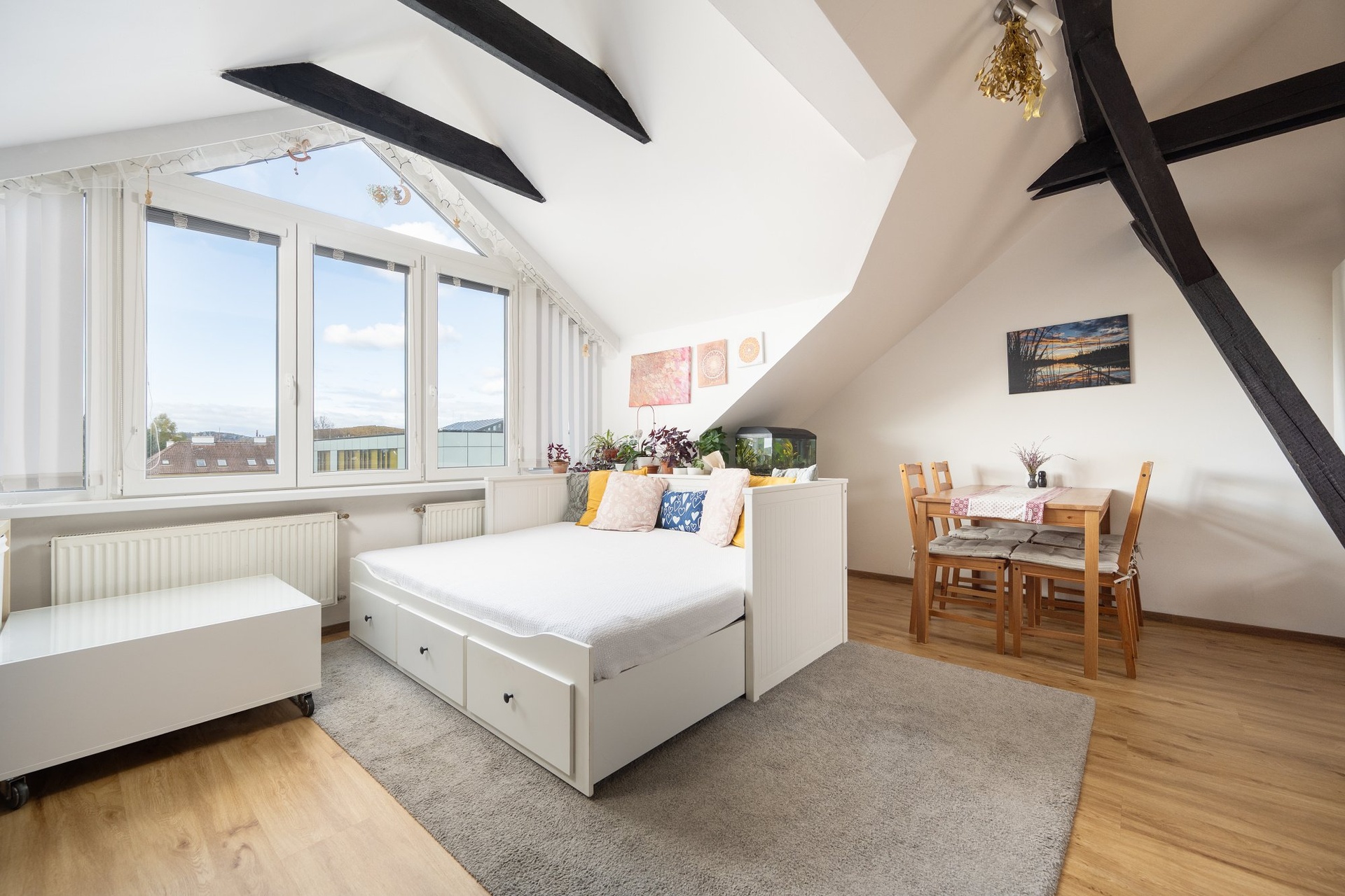 Dominantním prostorem je obývací pokoj s kuchyní ve tvaru L. Světlo přináší velkoformátové okno s výhledem do krajiny a také na nově rekonstruované náměstí a klidného vnitrobloku.