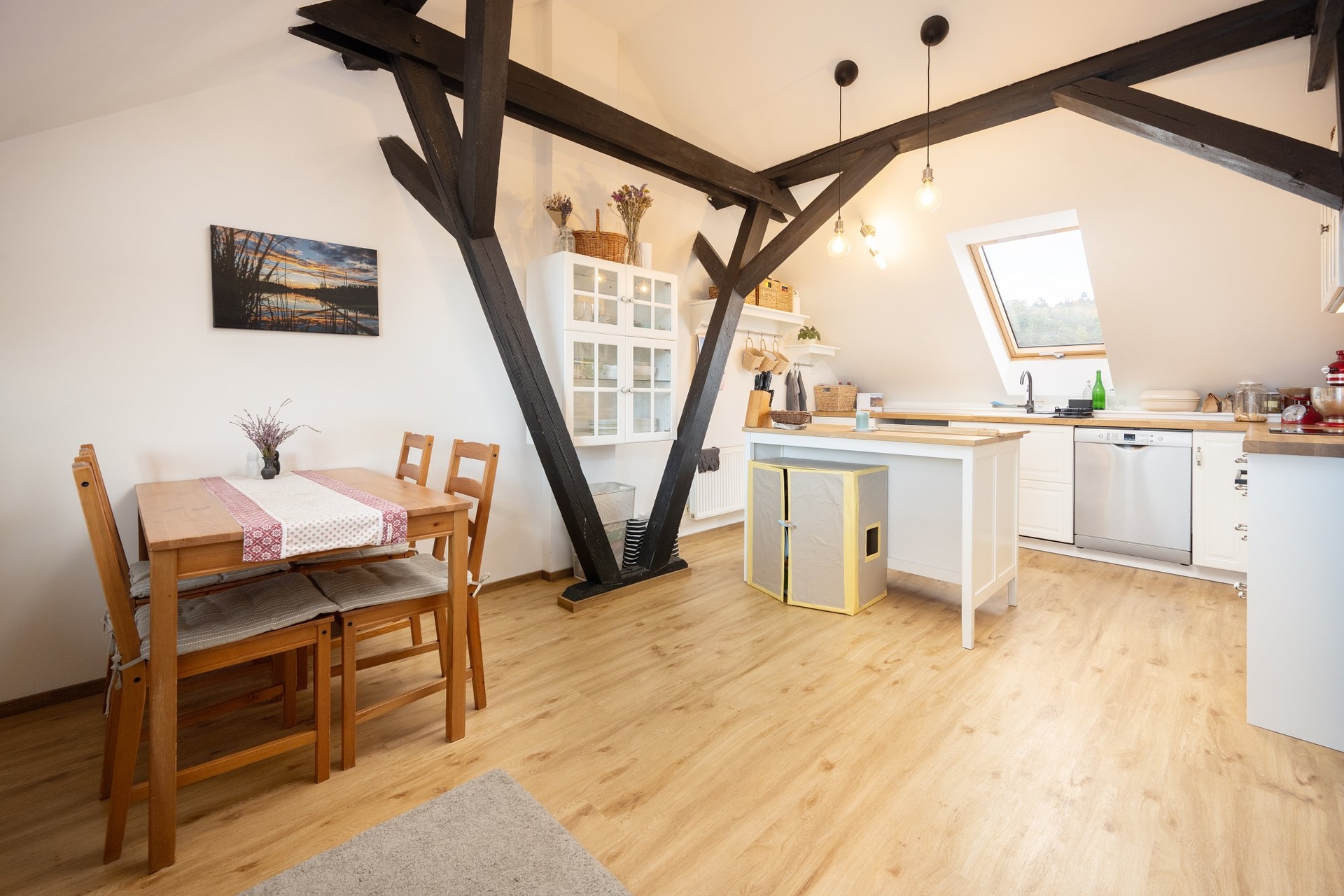 Hlavními designovými prvky v interiéru jsou krásné dřevěné nosné trámy. Vstupní chodba bytu je ozvláštněna krátkým schodištěm. Celý prostor je chodby působí velmi vzdušně a světle. V bytě je spousta úložných prostor a vestavěných skříní.
