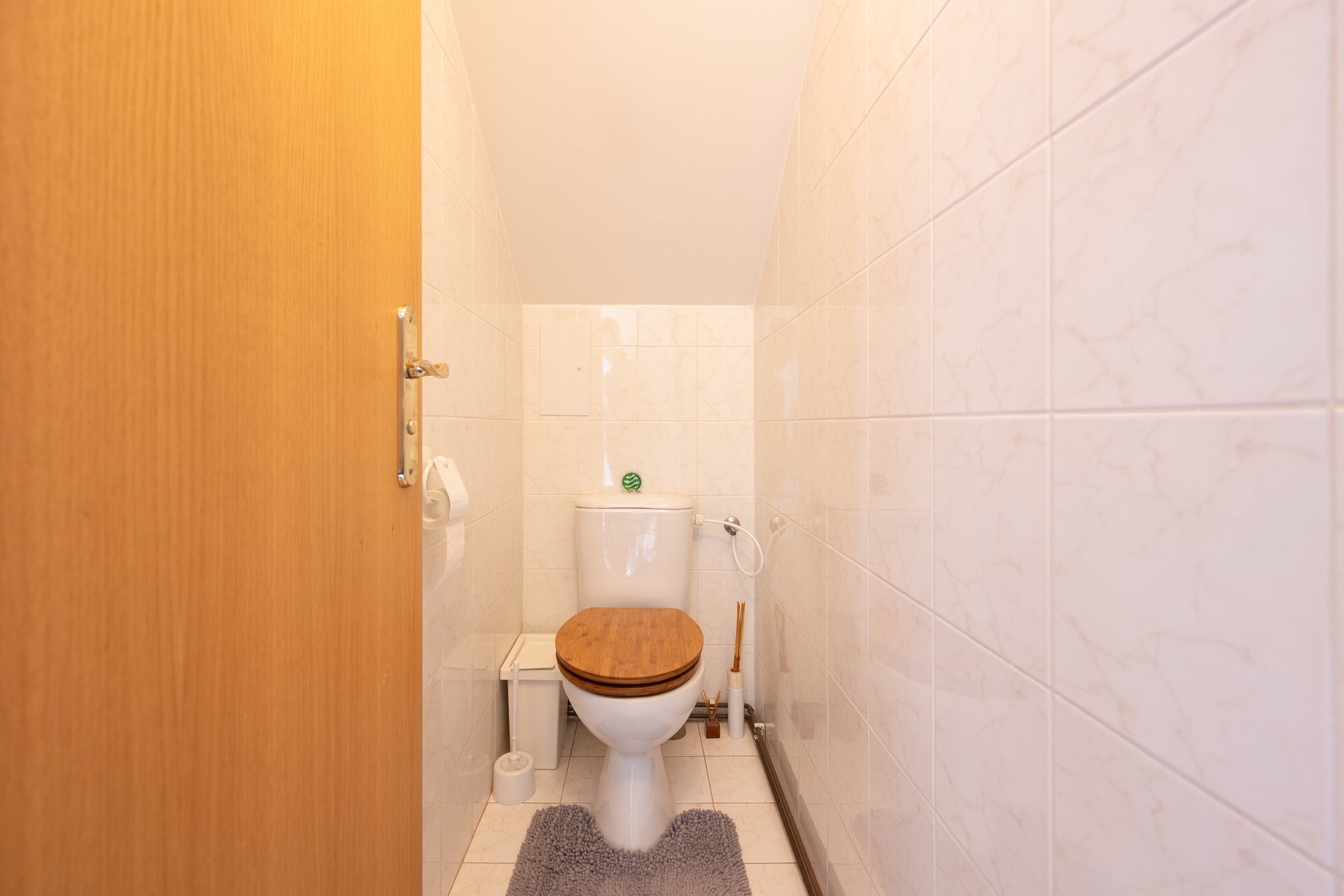 V chodbě je prostorná koupelna s vanou a sprchovým koutem, je zde i místo na pračku. Toaleta je samostatná.