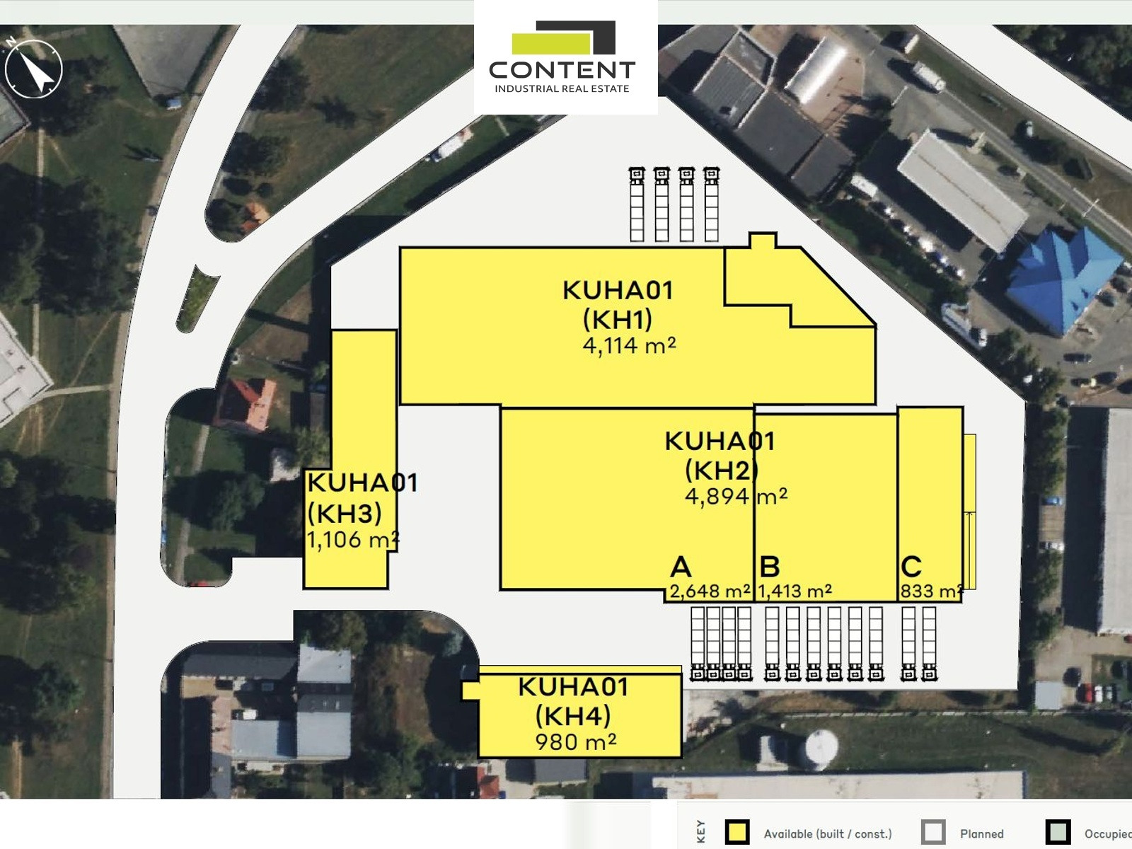- lze pronajmout celý areál, budovy KH3 1106 m² a KH4 980 m² samostatně nebo hlavní budovy KH1+KH2 cca 9000 m² dohromady