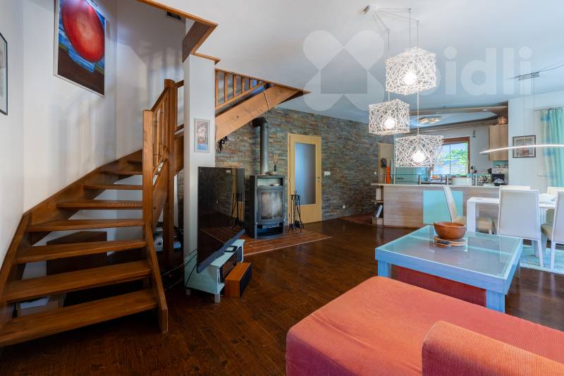 Kvalitní materiály a design: Dům je postaven z prvotřídních materiálů, disponuje dřevěnými eurookny, střešní krytina je z pálené glazurované tašky. V interiéru najdete kompletně vybavenou kuchyňskou linku a krbová kamna na dřevo o výkonu 10 kW.