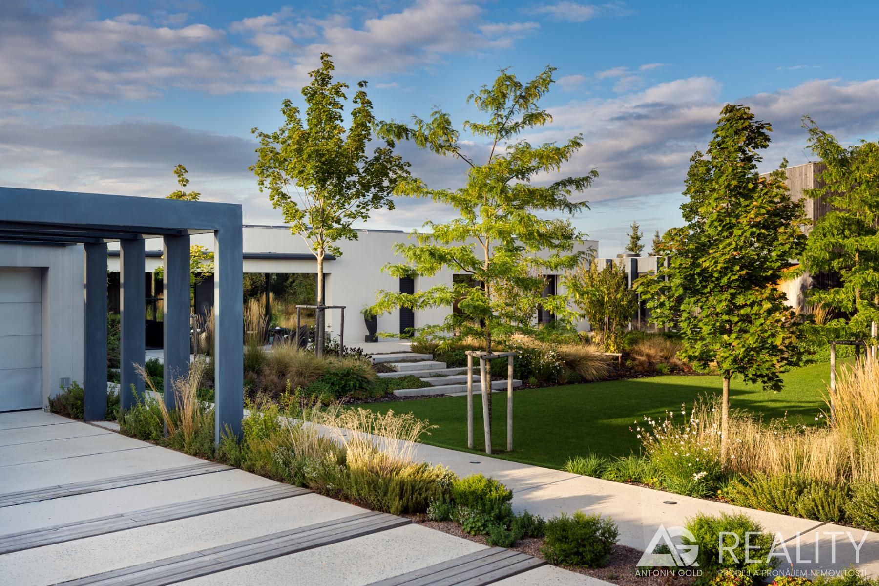 Součástí komplexu je také prostorná dvougaráž a zastřešené parkování pro další vozy, které podtrhují eleganci celého projektu.