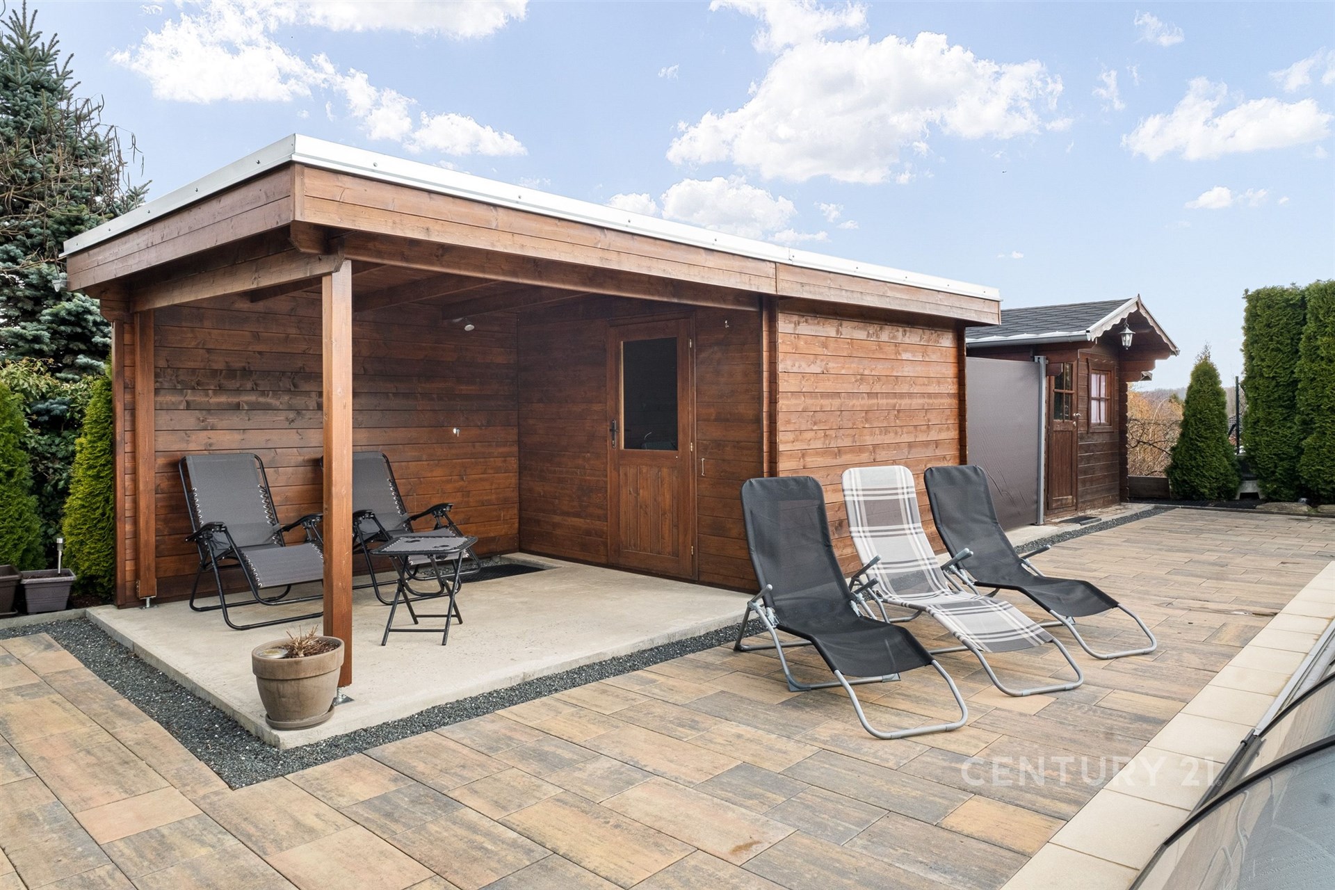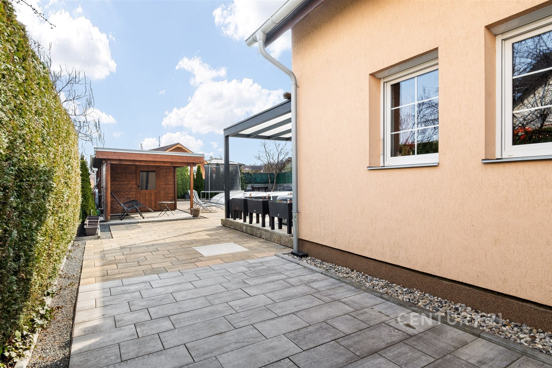 Zahrada je skutečnou oázou klidu a soukromí, připomínající malý soukromý resort. Dominantou je plně automatizovaný bazén (7 × 3 m) se slanou vodou, vyhřívaný tepelným čerpadlem. K dispozici je zastřešená terasa s potenciálem dalšího rozšíření, například o vířivku. Nechybí zahradní domek, prostor na dřevo ani samostatný objekt připravený pro vybudování sauny. Příjemné venkovní posezení s krbem přímo vybízí k relaxaci, grilování i setkávání s rodinou a přáteli.
