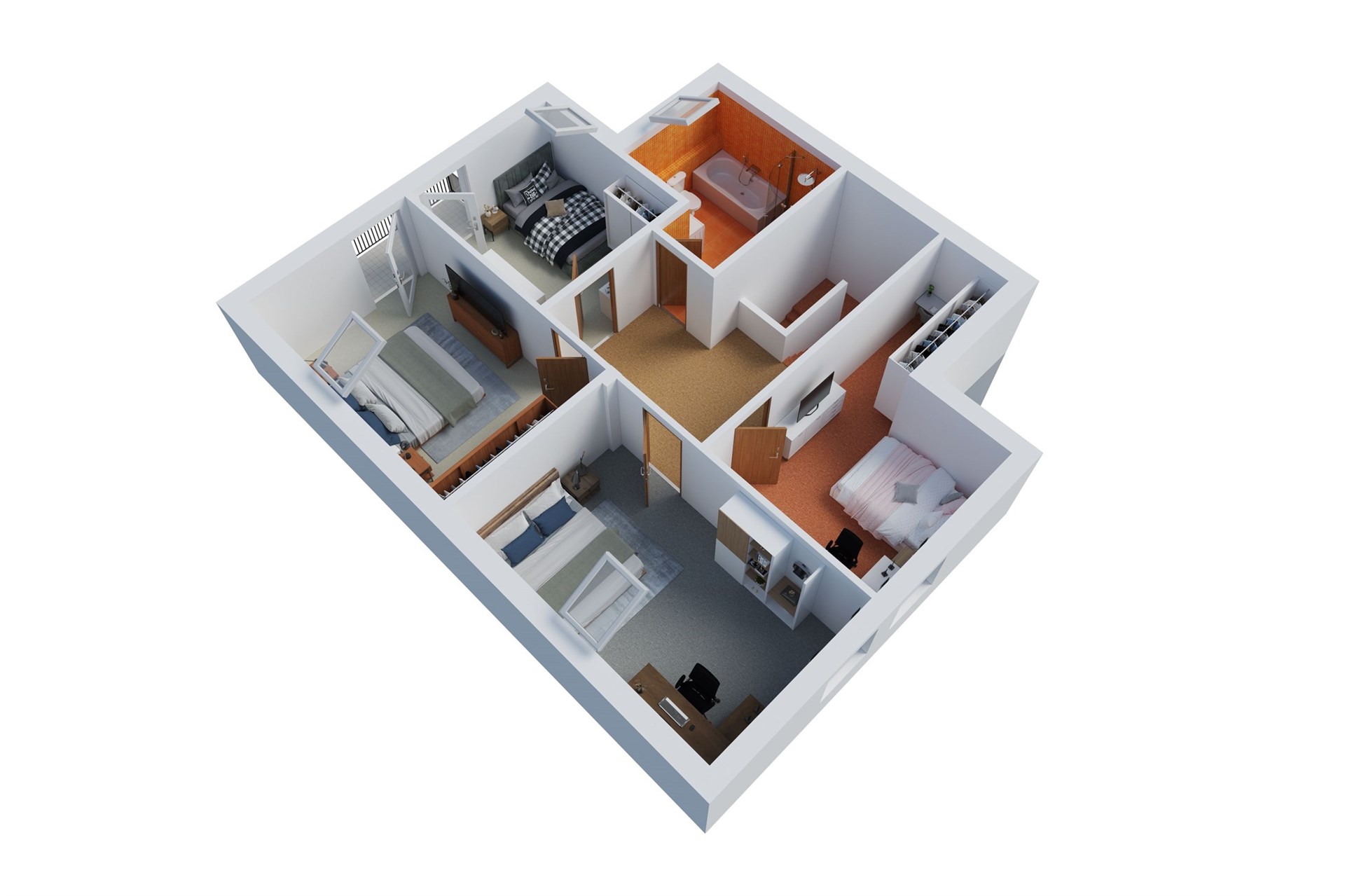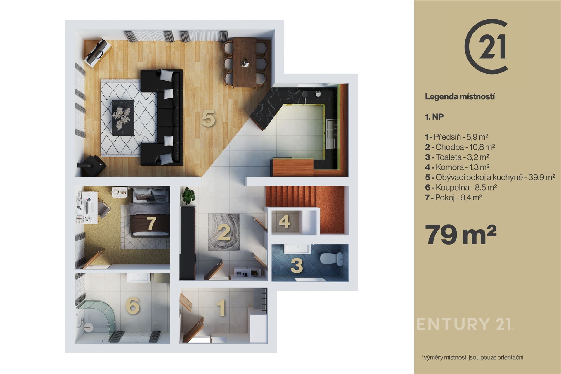 Velkou výhodou je promyšlená dispozice, která kromě hlavních obytných prostor nabízí i samostatný pokoj s vlastní koupelnou – ideální pro hosty, dospívající děti nebo práci z domova.