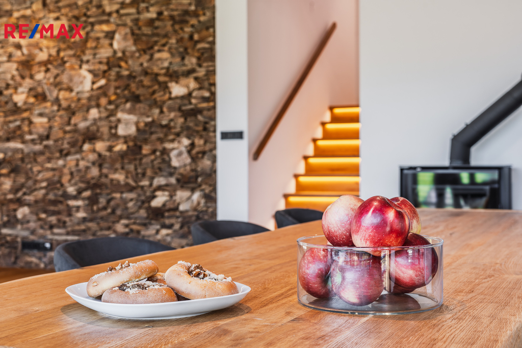 Designová sauna a kuchyně Schüller s masivním jídelním stolem