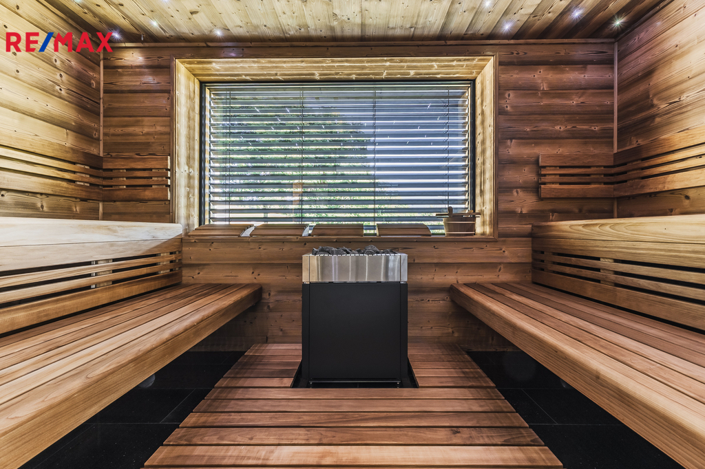 Přízemí: velkorysý prosklený obývací pokoj s krbovými kamny, wellness se saunou a odpočívárnou, koupelna, zádveří, technická místnost, zahradní sklad